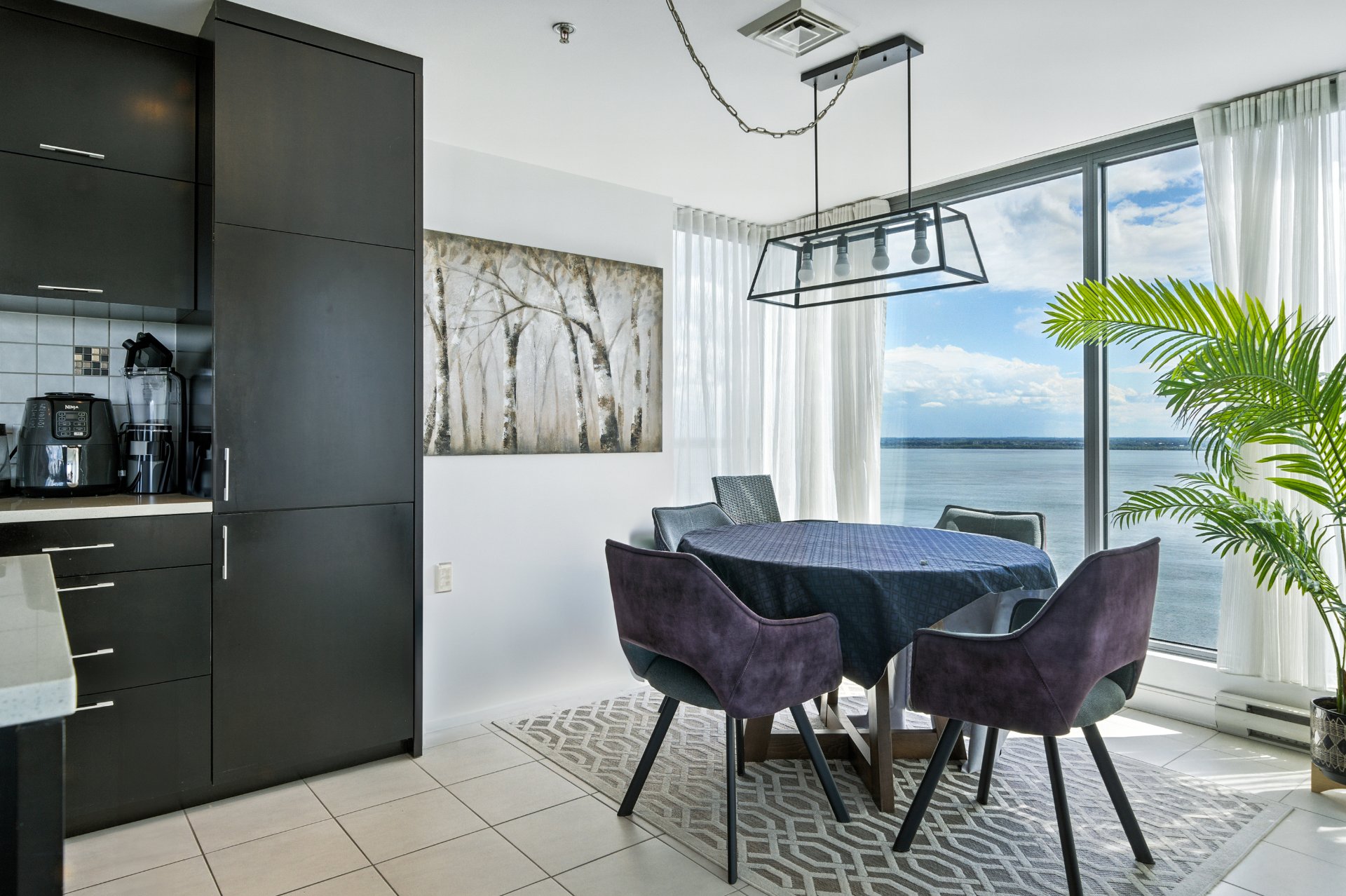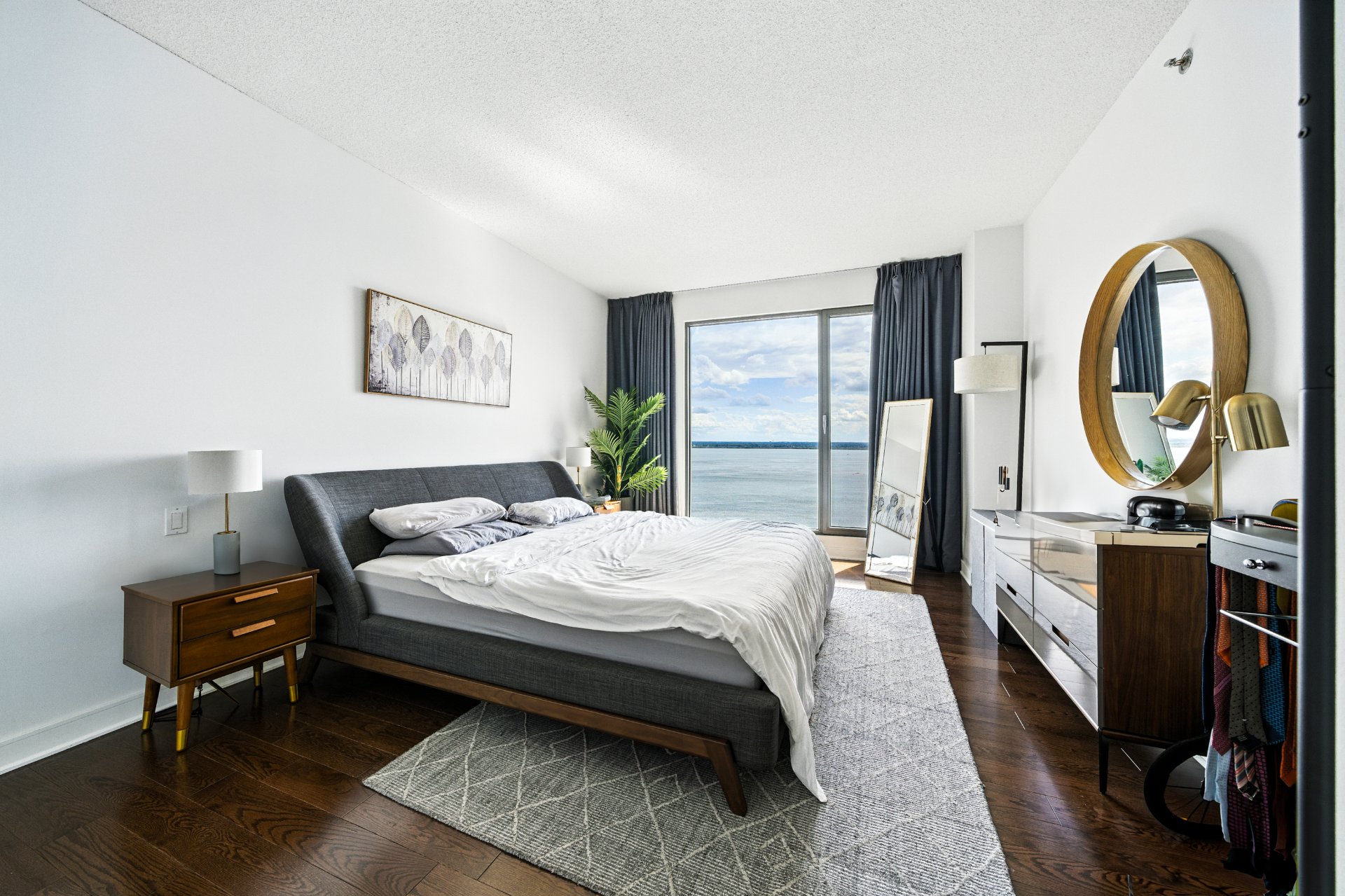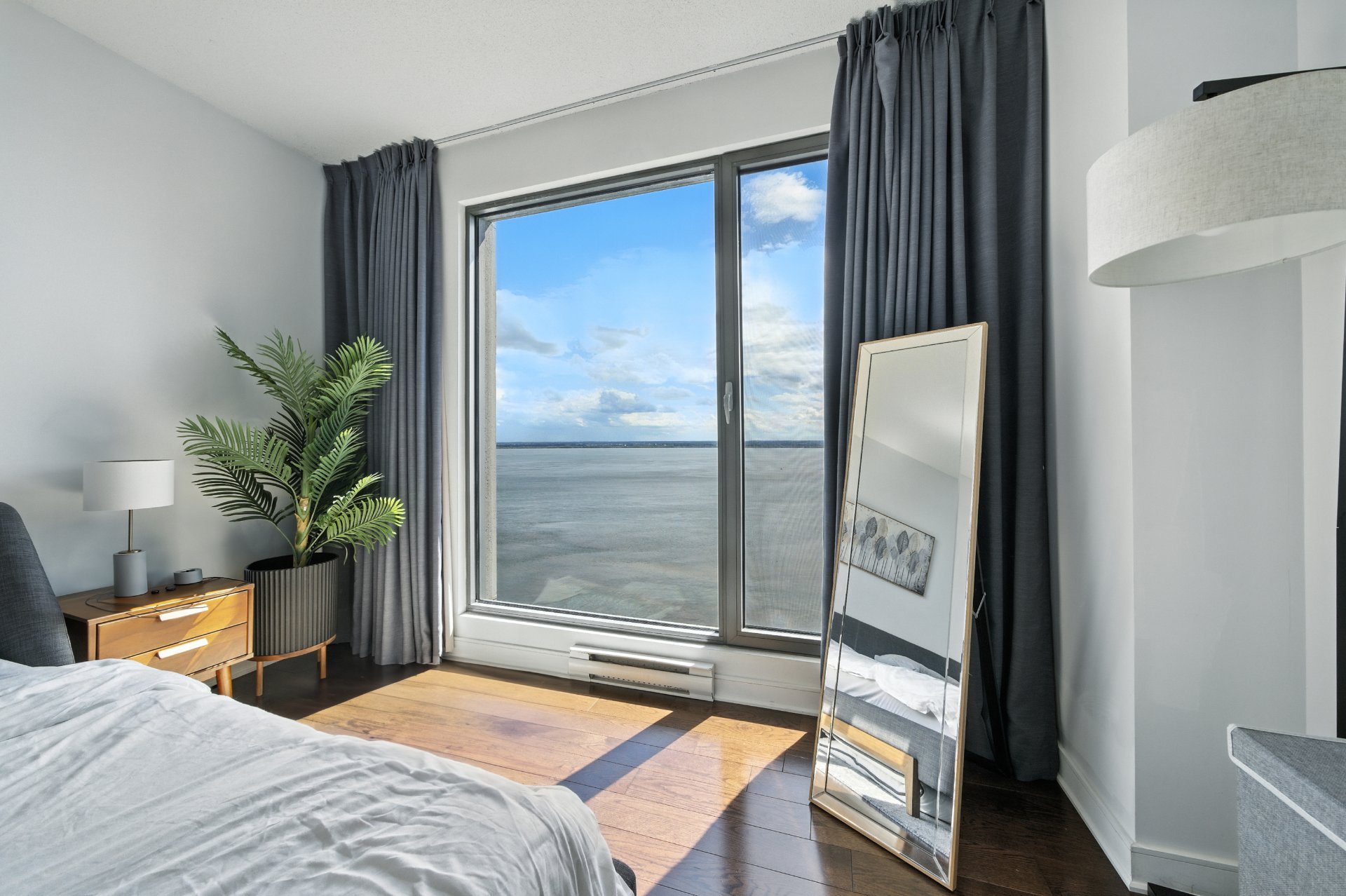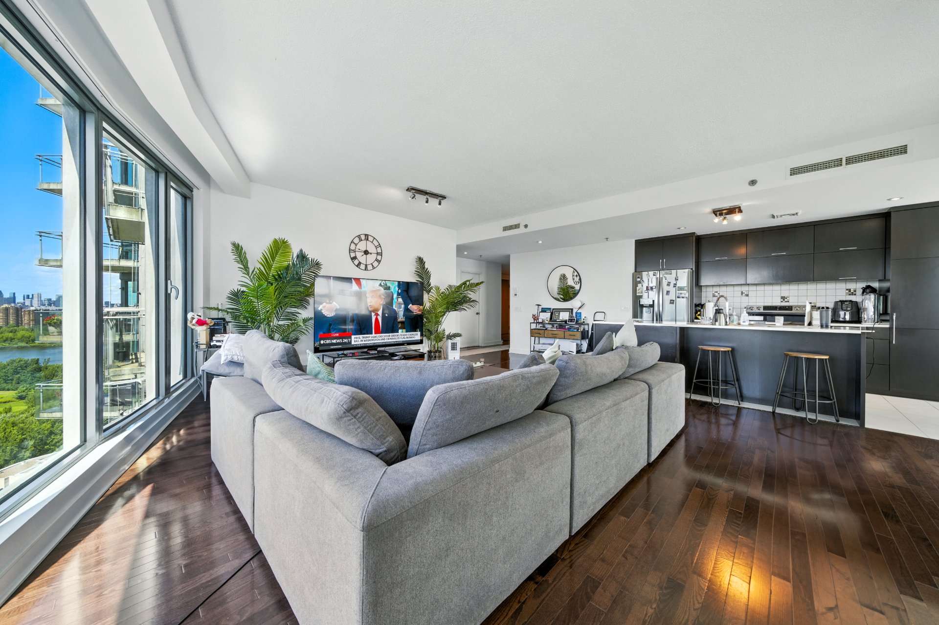 Sumptuous condo on the 22nd floor of the prestigious Vistal 1, LEED Gold certified, offering 1,485 sq. ft., 2 bedrooms, 2 bathrooms, abundant windows and panoramic views of the river and golf course. Bright open concept, wood floors, kitchen and bathrooms with wood cabinets and granite countertops, private balcony, storage and indoor parking. Geothermal building with 24/7 doorman, pools, spa, gym, conference room and more. Ideal location on Nuns' Island, 5 minutes from downtown! See addendum for location requirements.