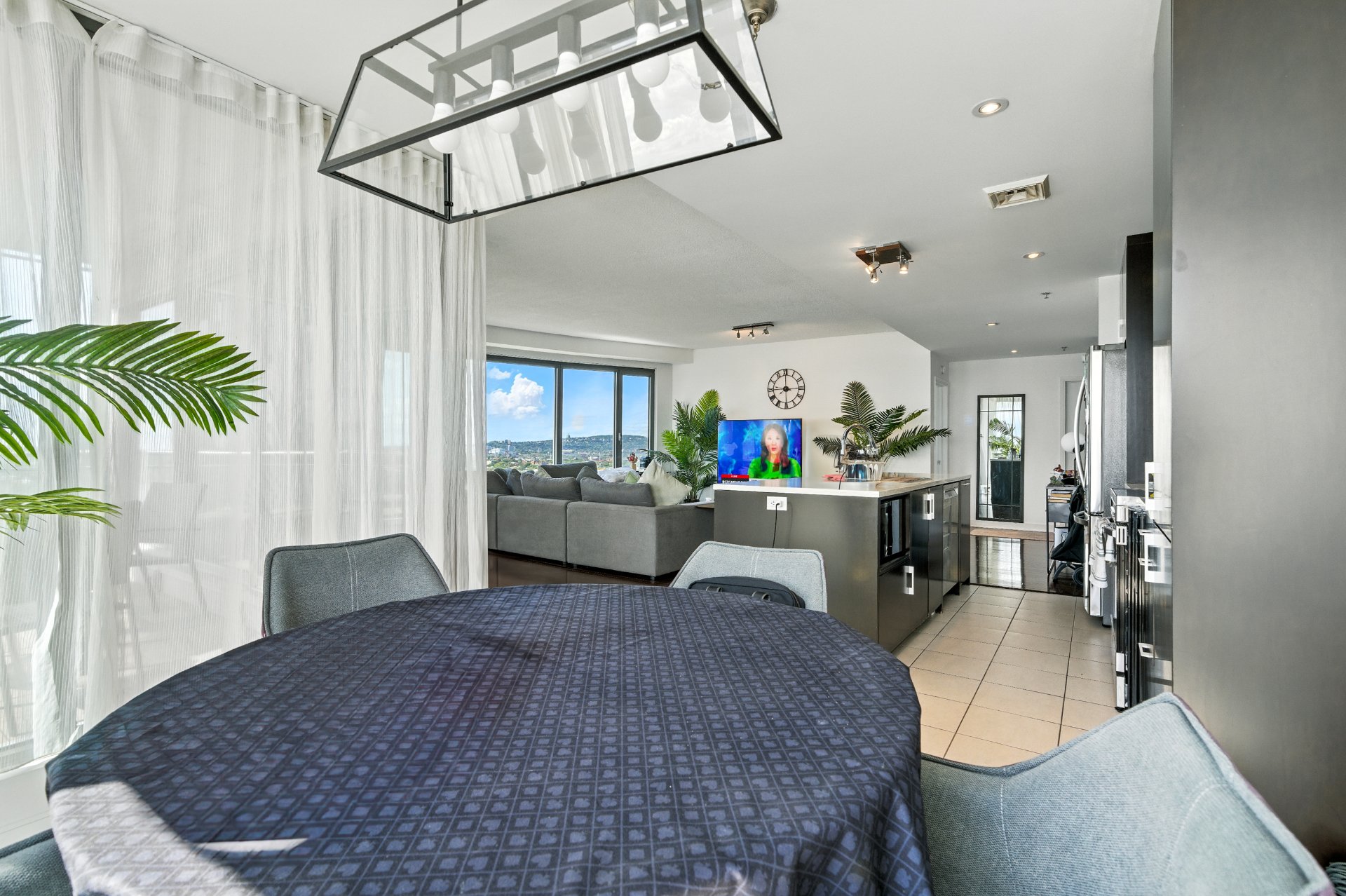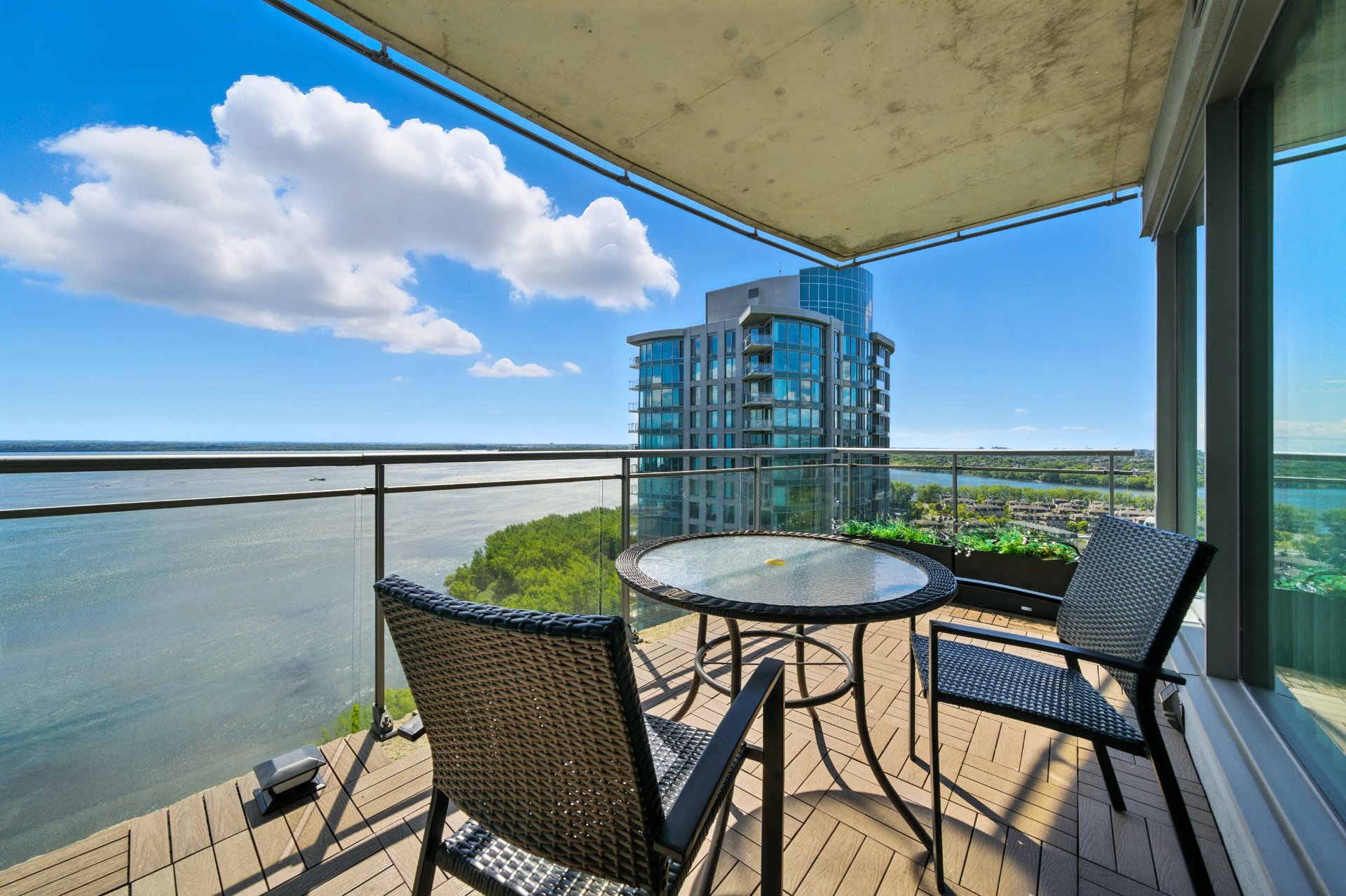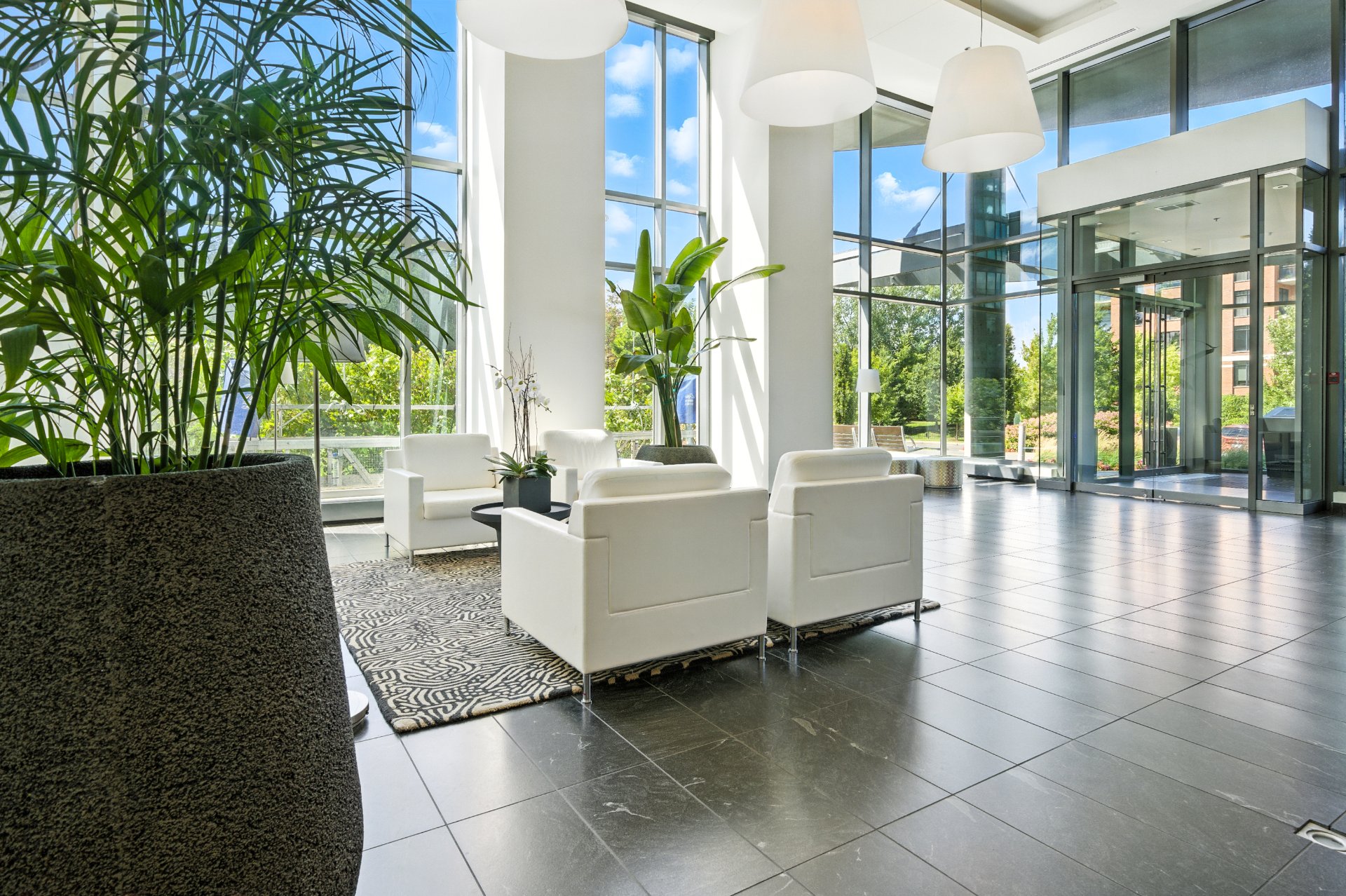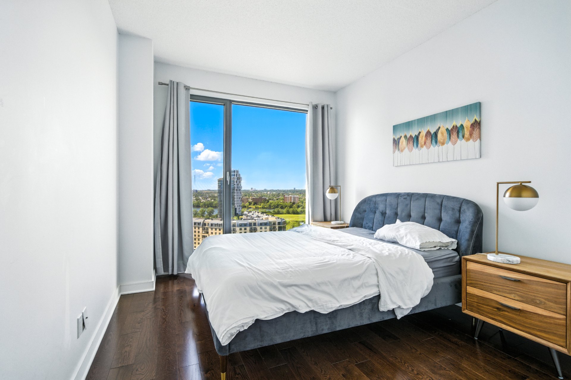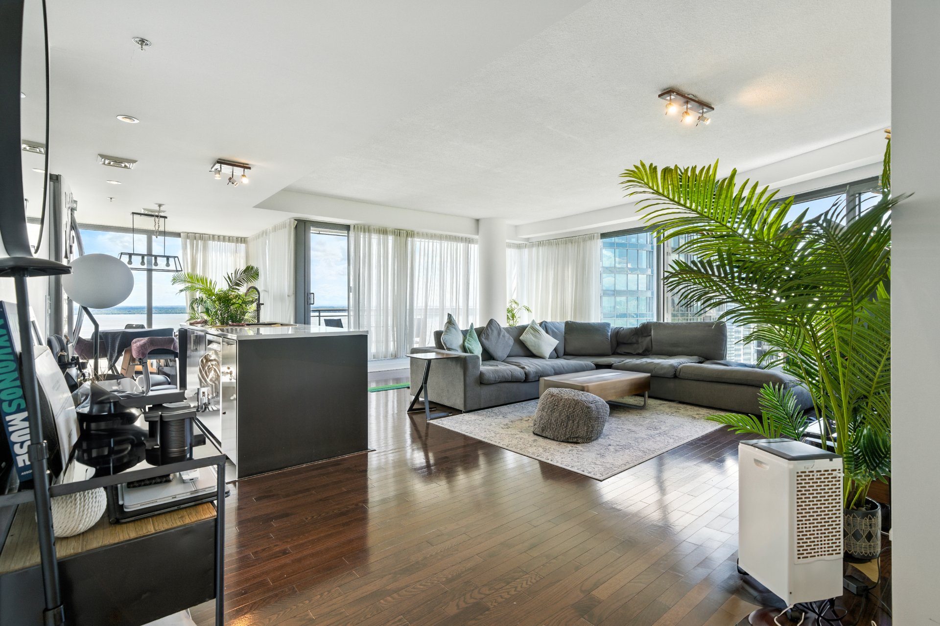 Sumptuous condo on the 22nd floor of the prestigious Vistal 1, LEED Gold certified, offering 1,485 sq. ft., 2 bedrooms, 2 bathrooms, abundant windows and panoramic views of the river and golf course. Bright open concept, wood floors, kitchen and bathrooms with wood cabinets and granite countertops, private balcony, storage and indoor parking. Geothermal building with 24/7 doorman, pools, spa, gym, conference room and more. Ideal location on Nuns' Island, 5 minutes from downtown! See addendum for location requirements.