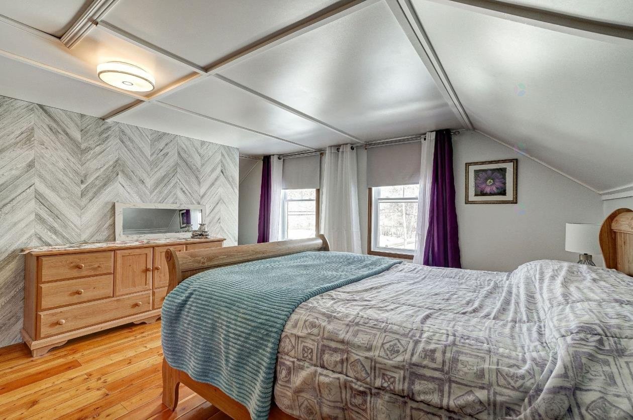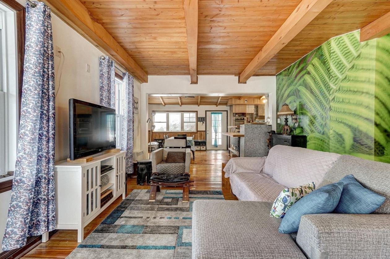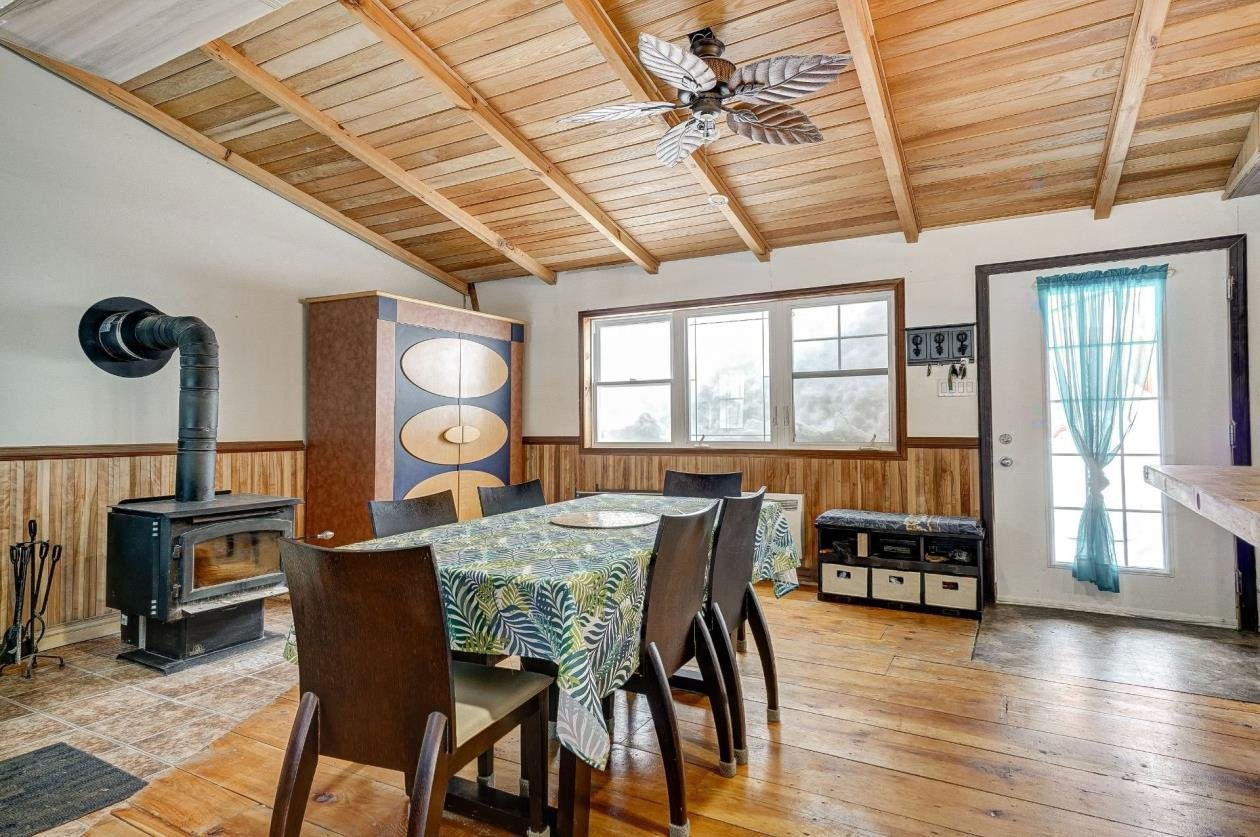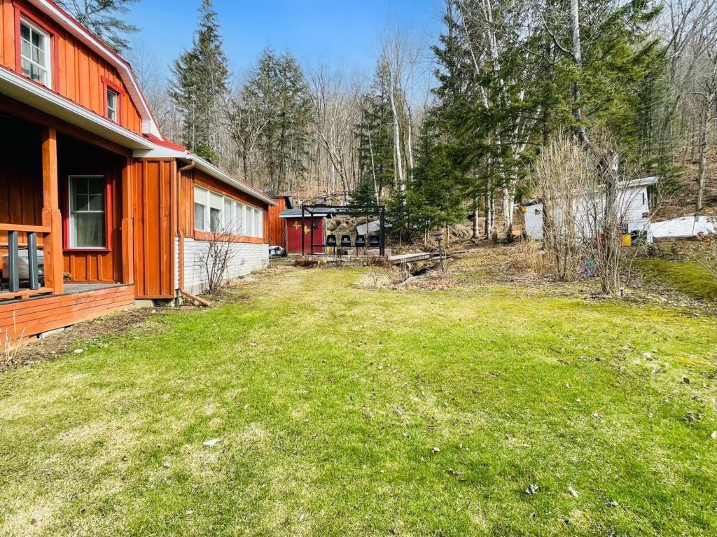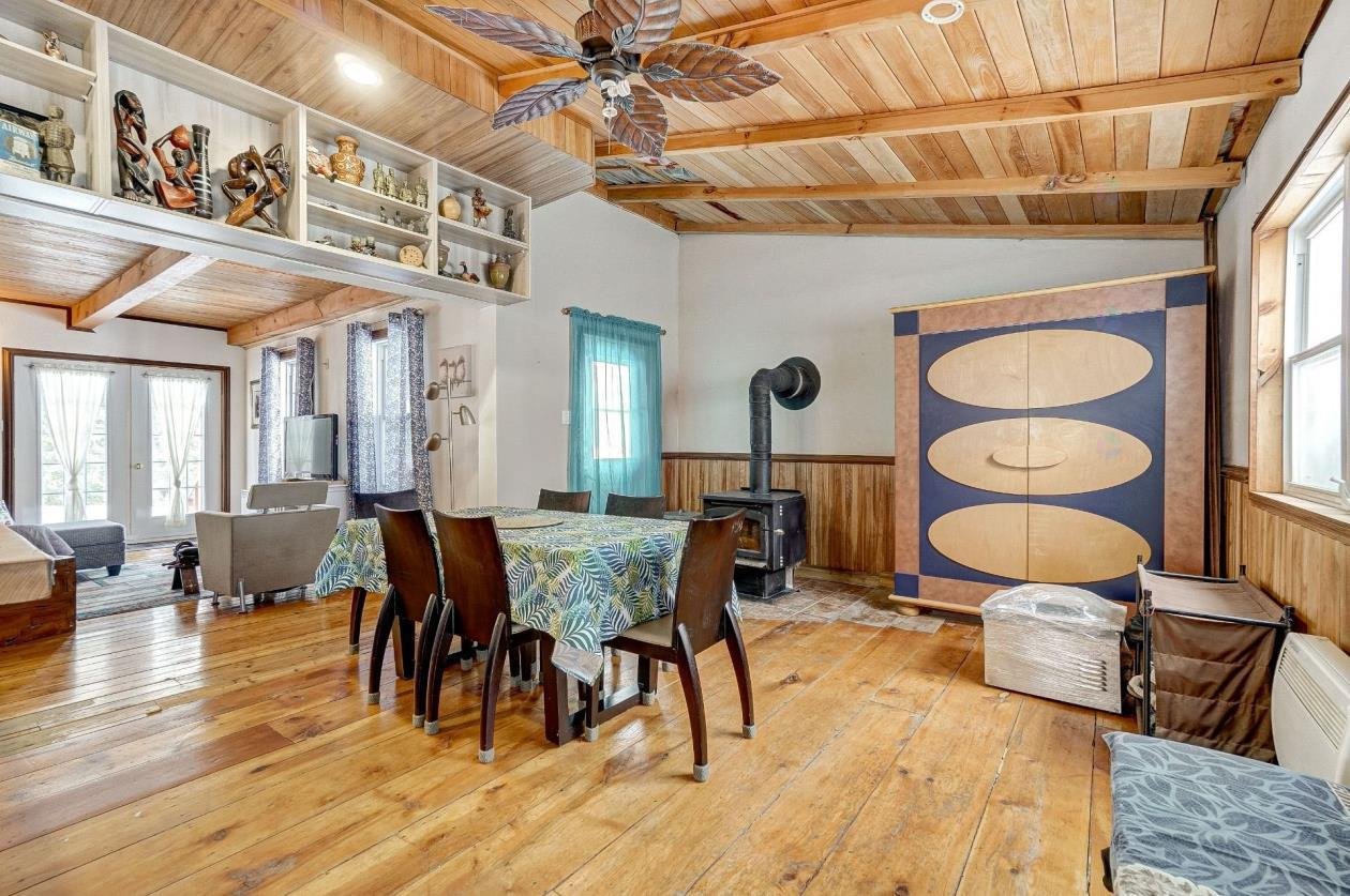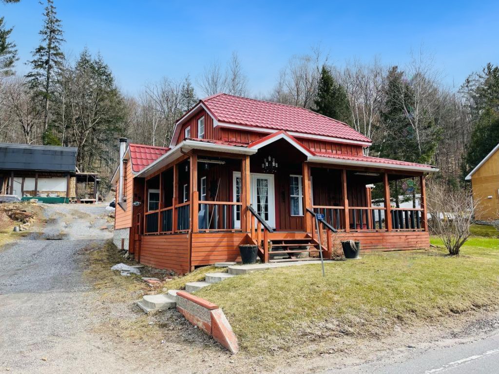 + Residential and commercial zoning + Property that has undergone some renovations + Updated kitchen: full-height cabinets, ceramic backsplash, wood lunch counter and chimney hood + Wood flooring (red pine) + 4-season veranda that can be used as an office or 2nd bedroom + Cathedral-style wood ceilings + Renovated bathroom with ceramic flooring + Living room with large windows and natural light + Wood stove in the main living area + Wooden staircase and railing + Upper level: primary bedroom, walk-in and powder room + Electric baseboard heating + Metal roof (clay tile style) + Wood exterior siding + Wood deck on three sides with roof + Three exterior sheds + Smal stream running through the property