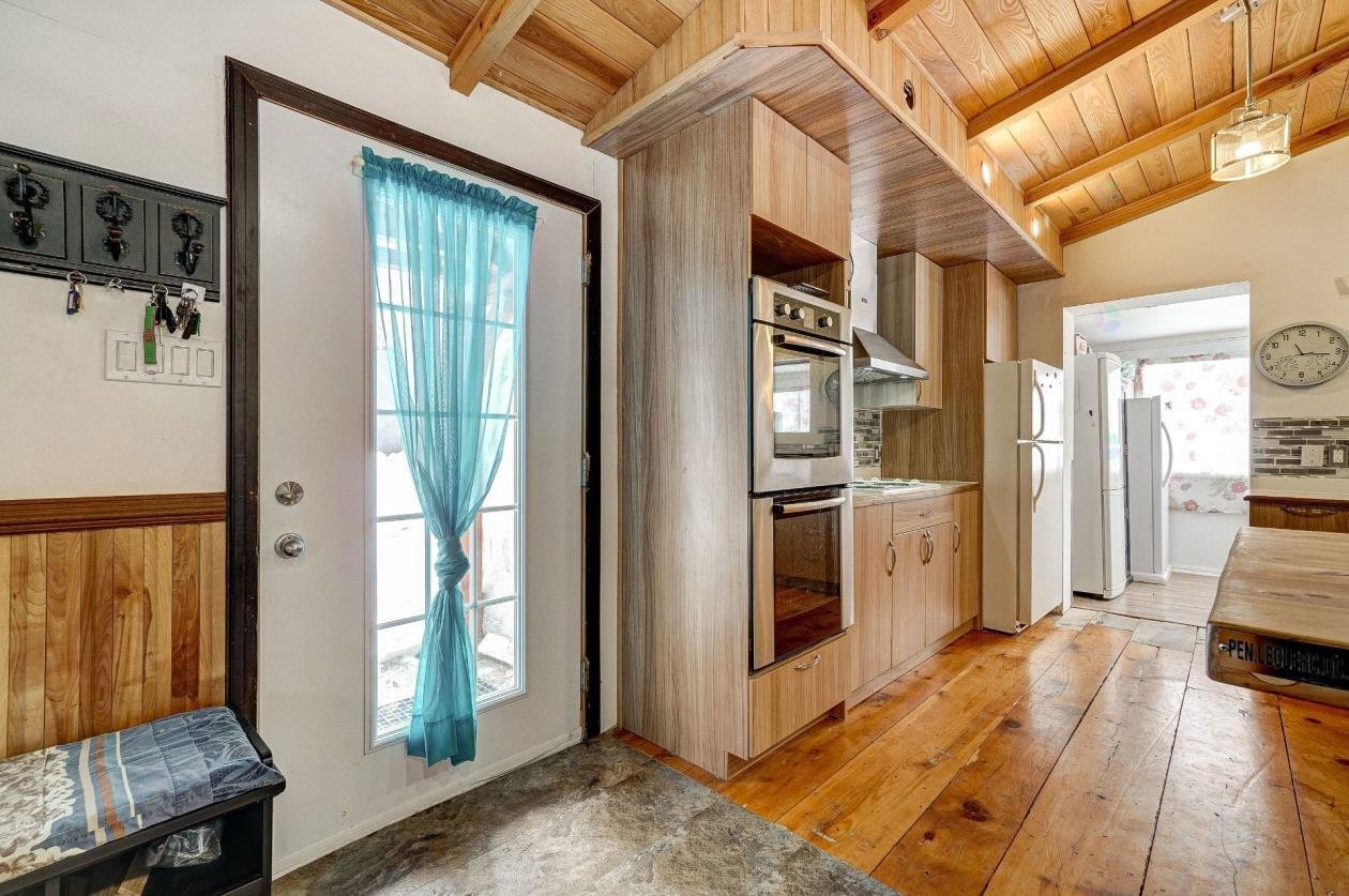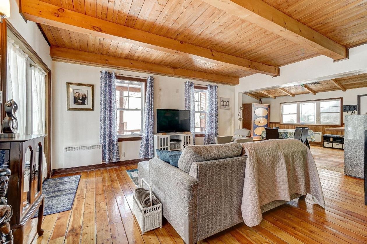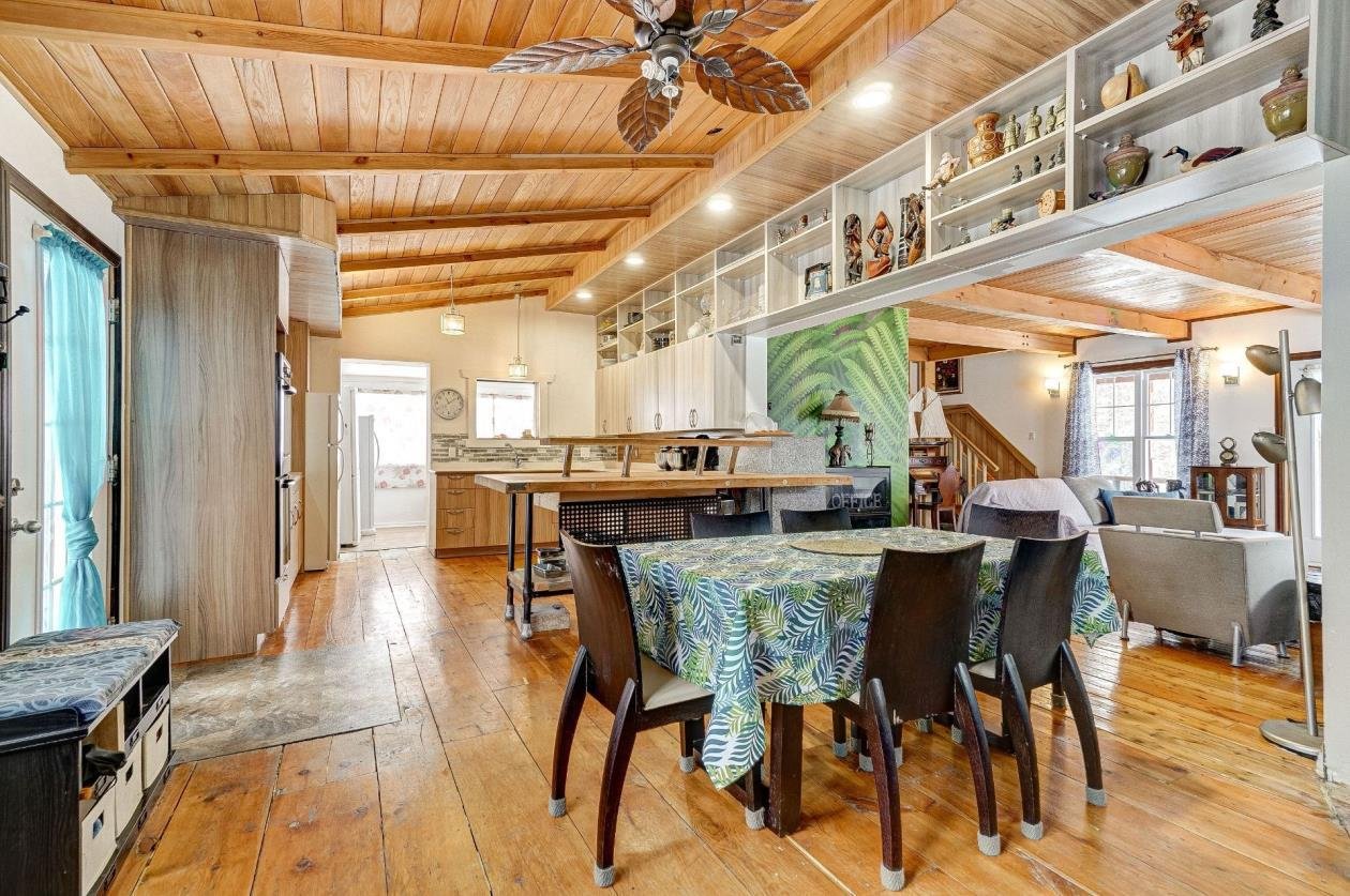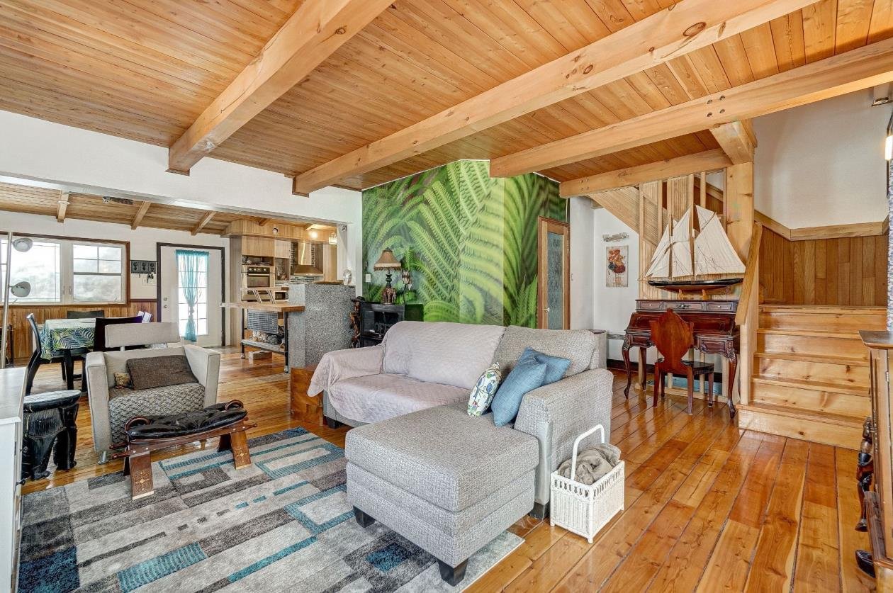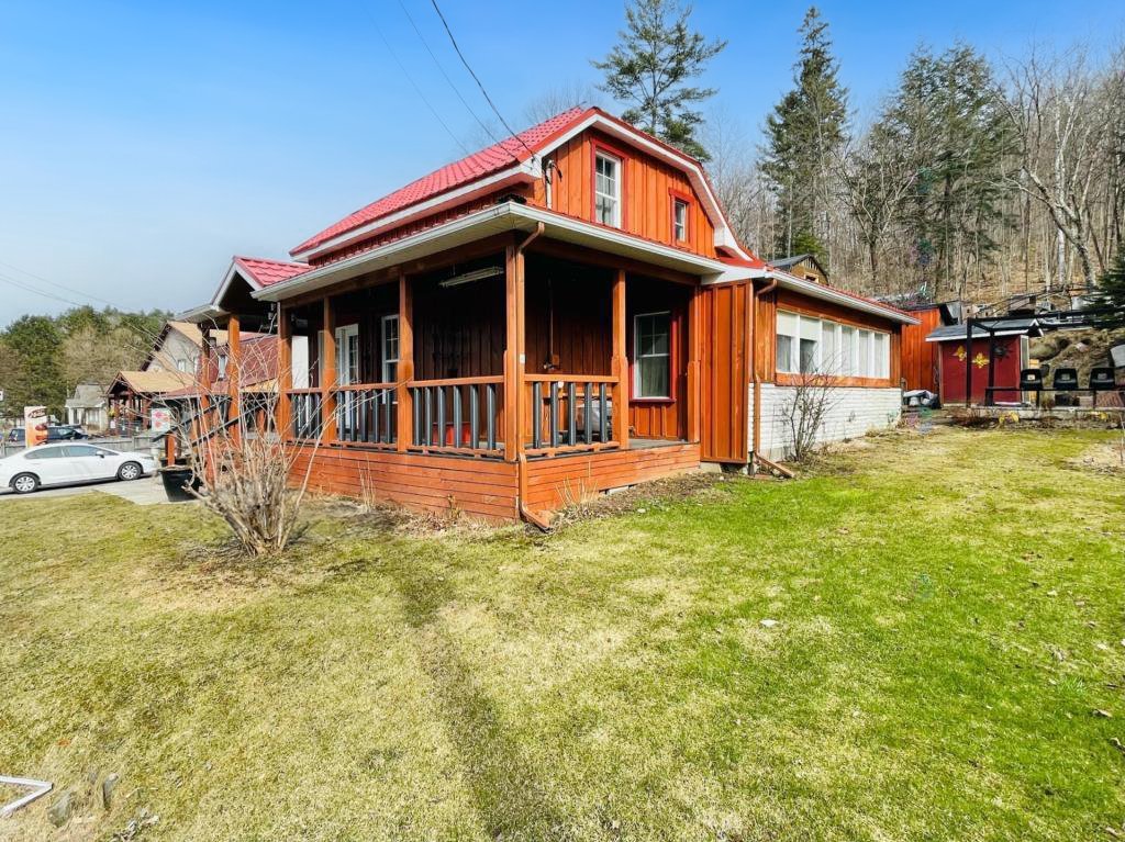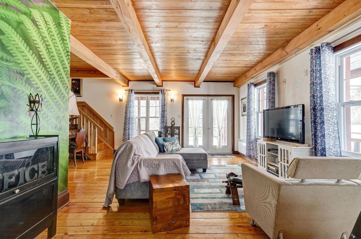 + Residential and commercial zoning + Property that has undergone some renovations + Updated kitchen: full-height cabinets, ceramic backsplash, wood lunch counter and chimney hood + Wood flooring (red pine) + 4-season veranda that can be used as an office or 2nd bedroom + Cathedral-style wood ceilings + Renovated bathroom with ceramic flooring + Living room with large windows and natural light + Wood stove in the main living area + Wooden staircase and railing + Upper level: primary bedroom, walk-in and powder room + Electric baseboard heating + Metal roof (clay tile style) + Wood exterior siding + Wood deck on three sides with roof + Three exterior sheds + Smal stream running through the property