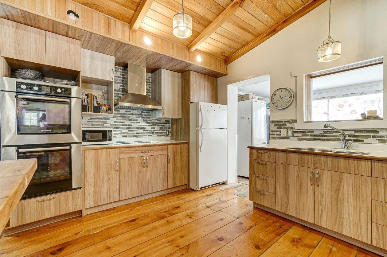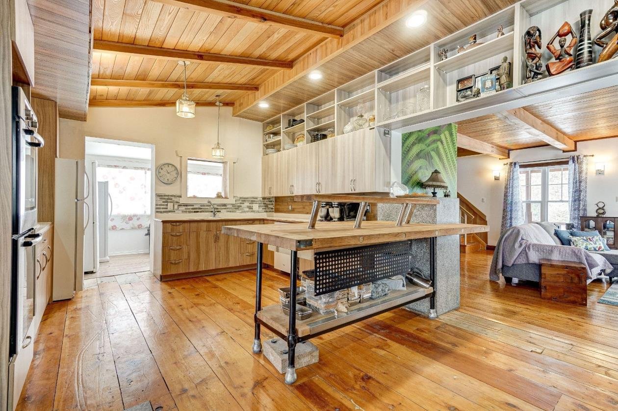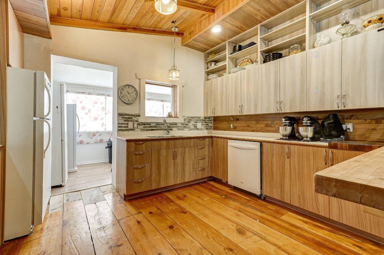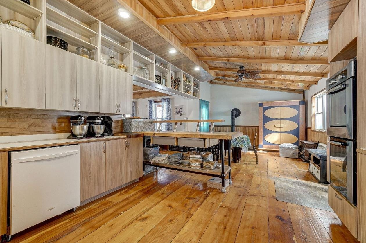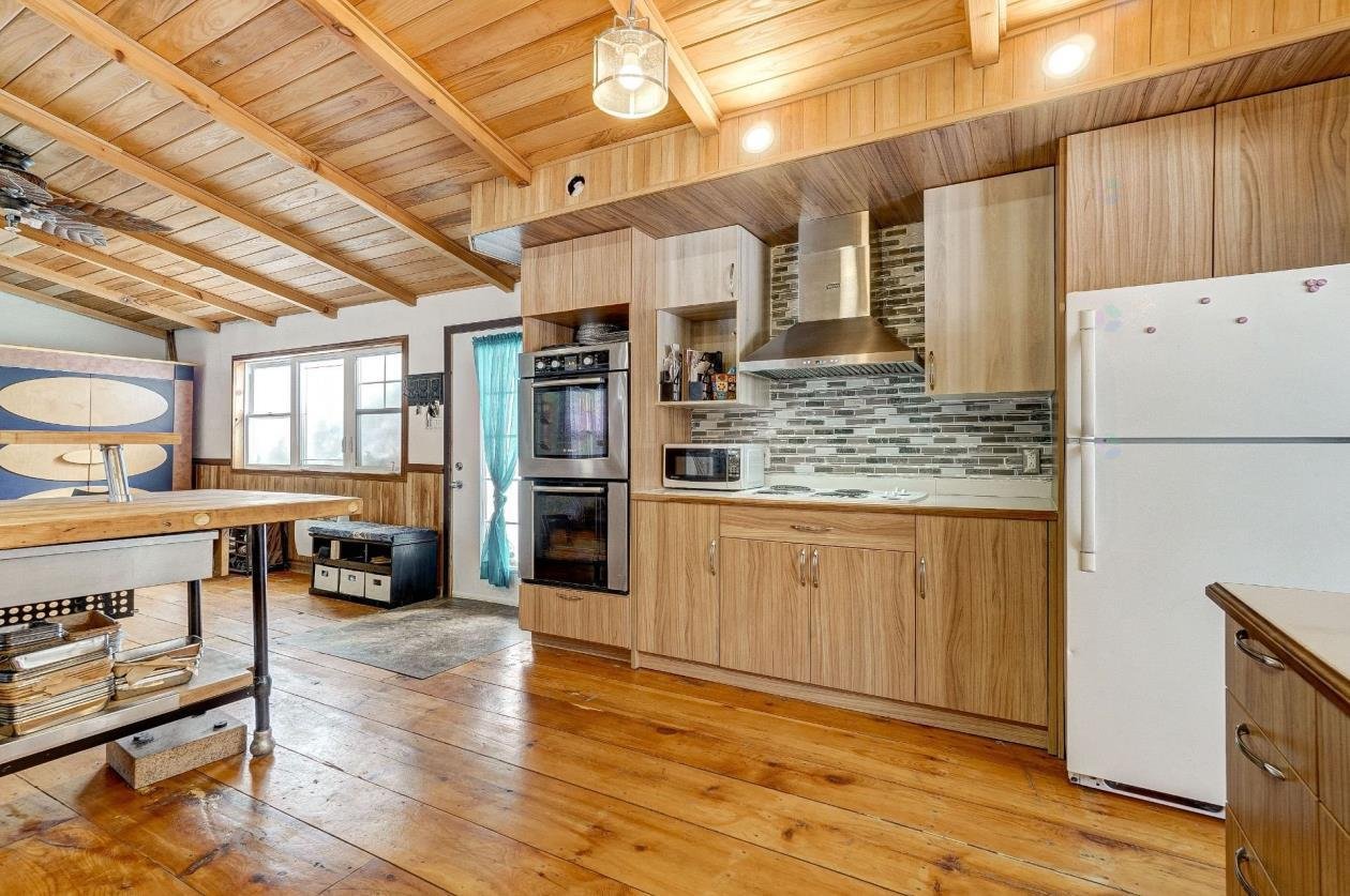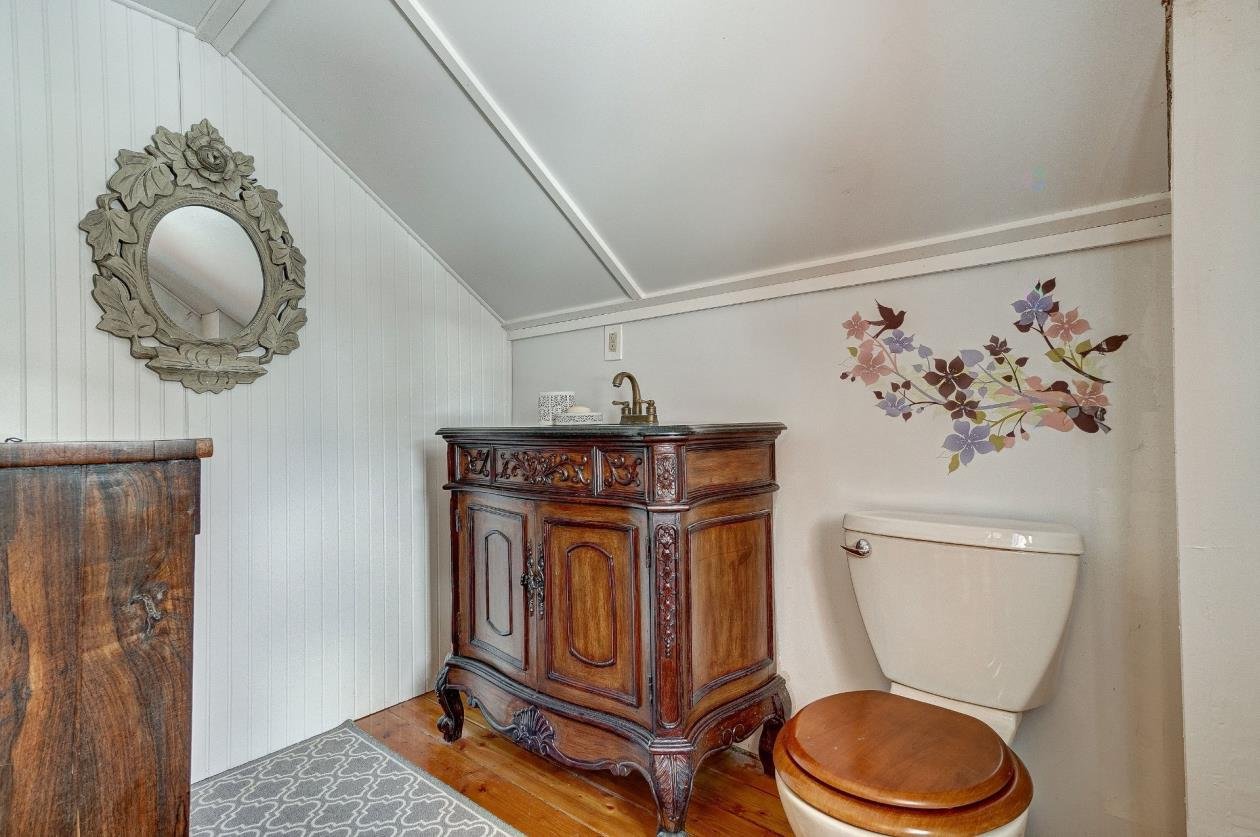 + Residential and commercial zoning + Property that has undergone some renovations + Updated kitchen: full-height cabinets, ceramic backsplash, wood lunch counter and chimney hood + Wood flooring (red pine) + 4-season veranda that can be used as an office or 2nd bedroom + Cathedral-style wood ceilings + Renovated bathroom with ceramic flooring + Living room with large windows and natural light + Wood stove in the main living area + Wooden staircase and railing + Upper level: primary bedroom, walk-in and powder room + Electric baseboard heating + Metal roof (clay tile style) + Wood exterior siding + Wood deck on three sides with roof + Three exterior sheds + Smal stream running through the property