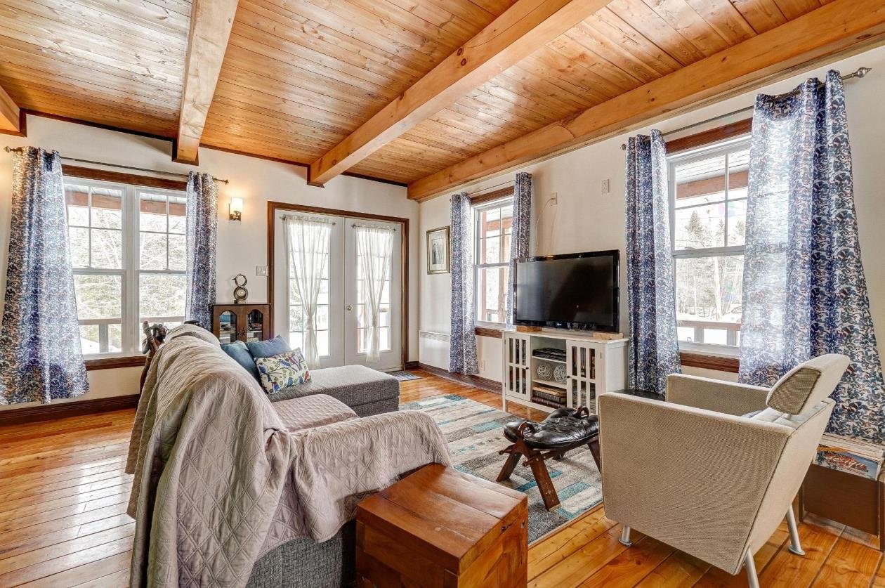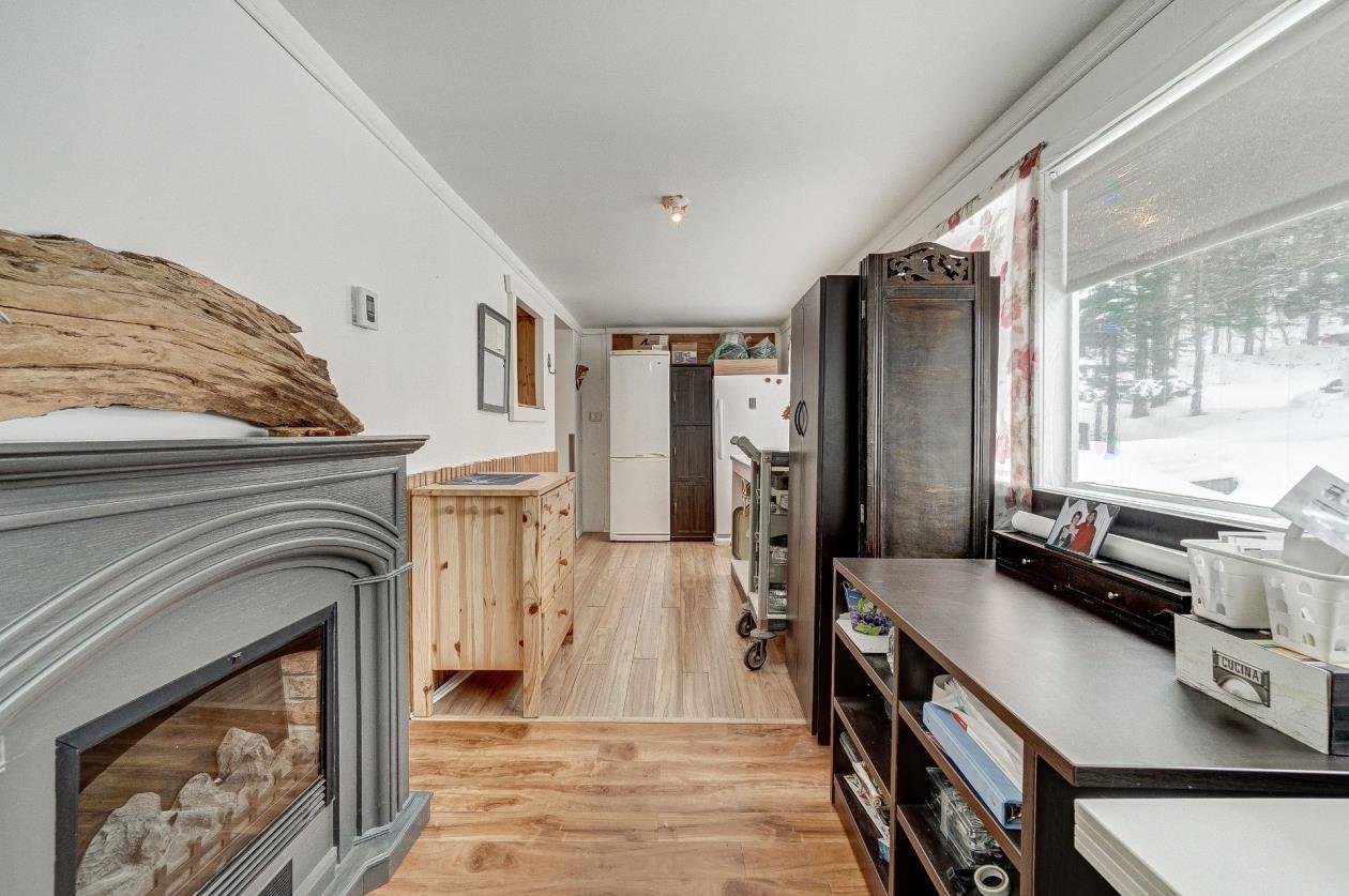 1,100 sq. ft. open-concept property. 1 bedroom, veranda that can be used as an office or 2nd bedroom, 1 full bathroom and 1 powder room. Kitchen with ceramic backsplash and storage. Wood stove, wood floors on two levels, ceilings with exposed beams. Living room with large windows. Primary bedroom with walk-in and adjoining powder room. Metal roof, wood exterior, covered gallery on three sides, three sheds. No rear neighbors. Walking distance to Lac Vert municipal dock, village services and the Albatros trail. Only 35 minutes from Buckingham!