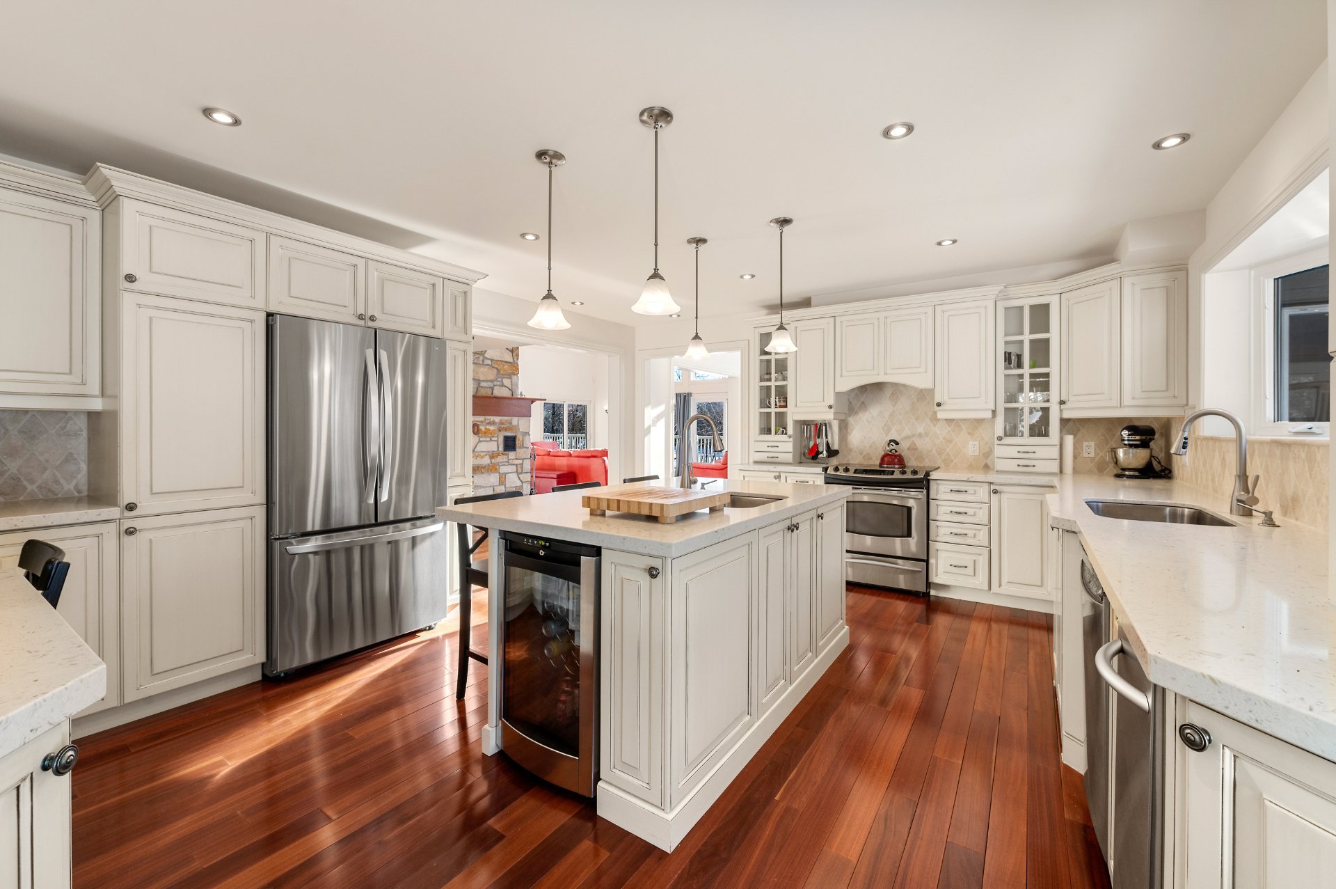quartz countertops. The dining room and living room, two