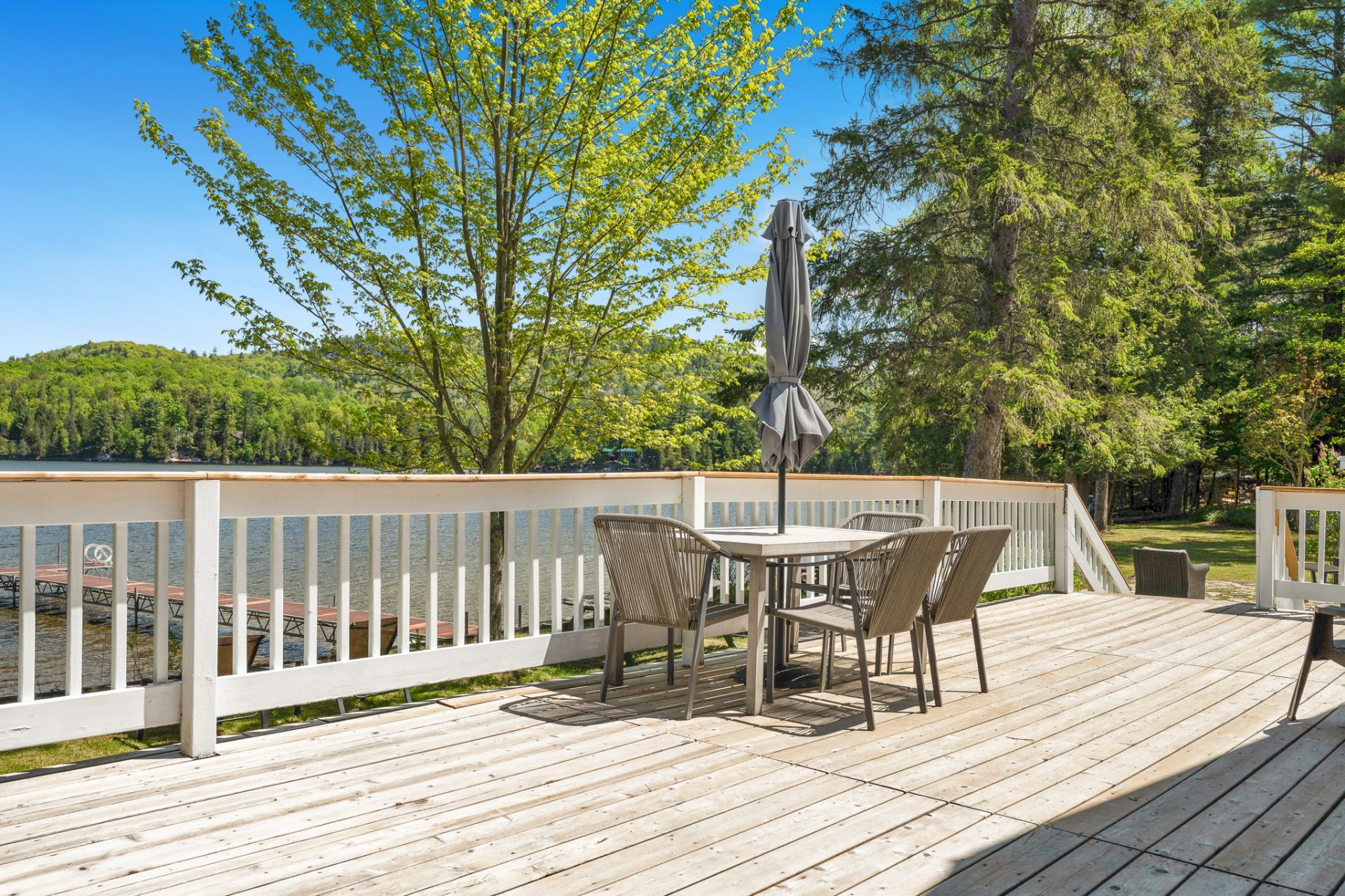 Deck: dining table and four chairs, umbrella plus stand, two brown resin Muskoka chairs and resin side table