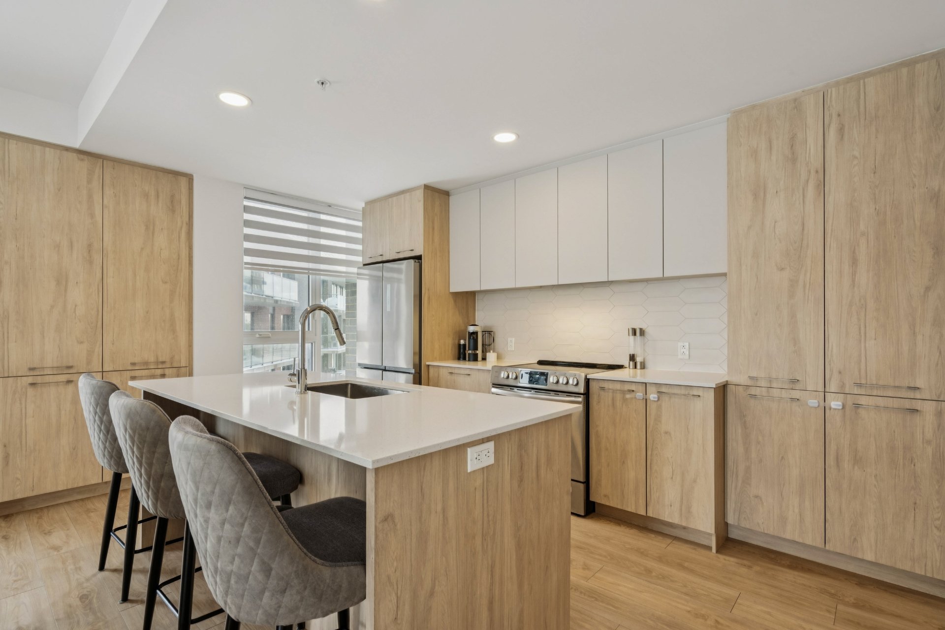 La cuisine contemporaine propose un grand îlot en quartz,