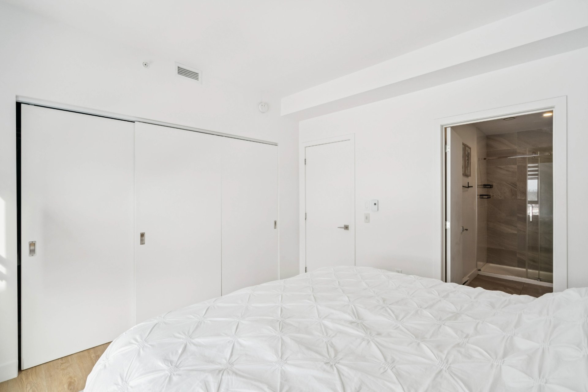 La chambre principale comprend une salle de bain attenante.