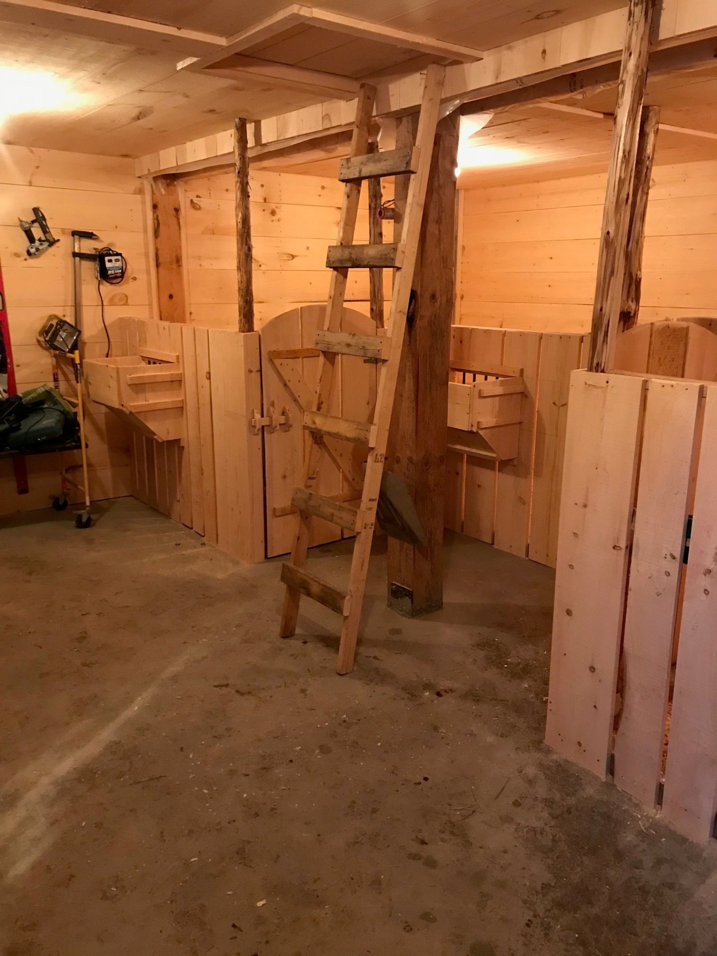 Îlot de cuisine, caisses de rangement en bois dans le garde-manger, tous les effets personnels, outils, équipements, bois coupé en tas de sciage.