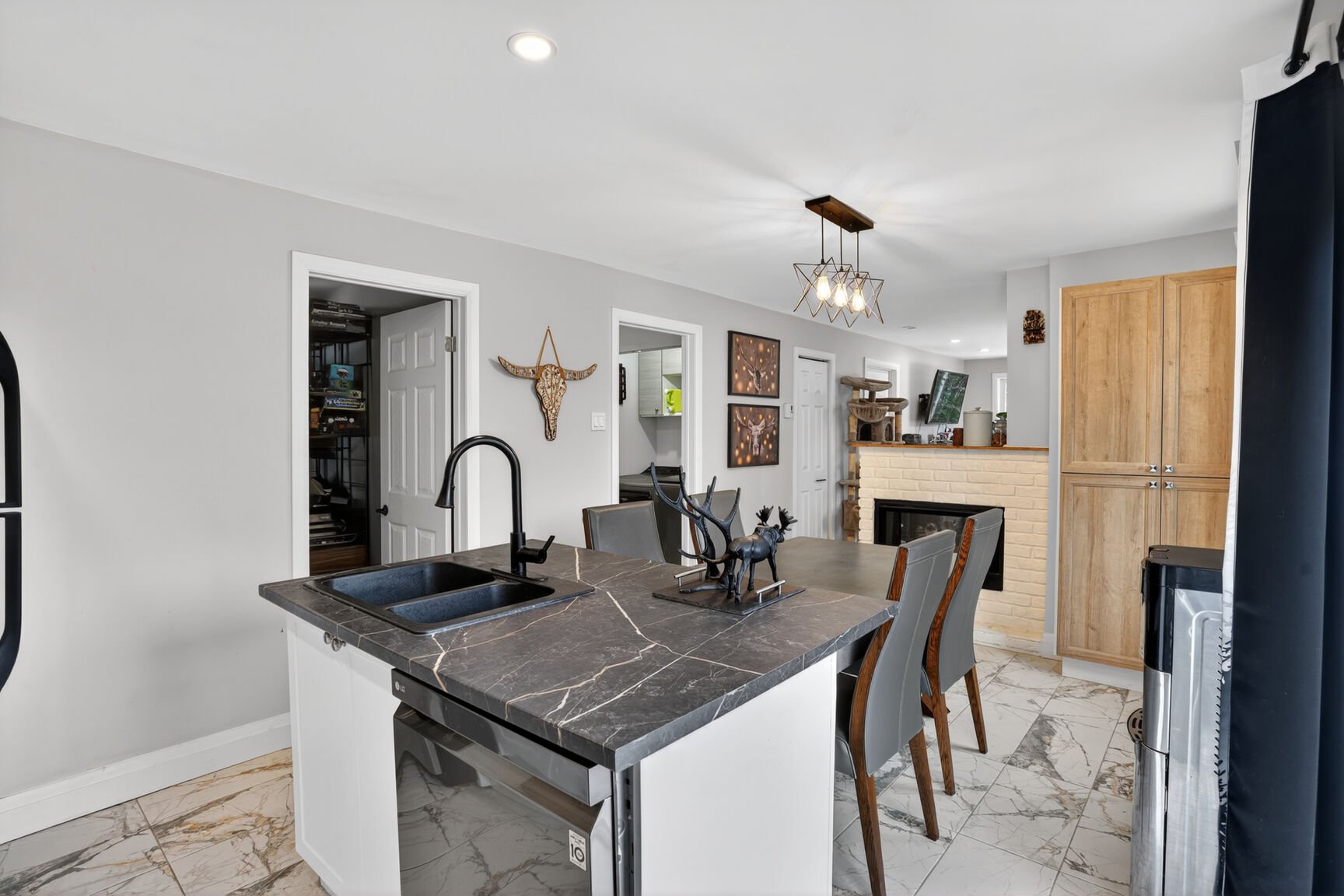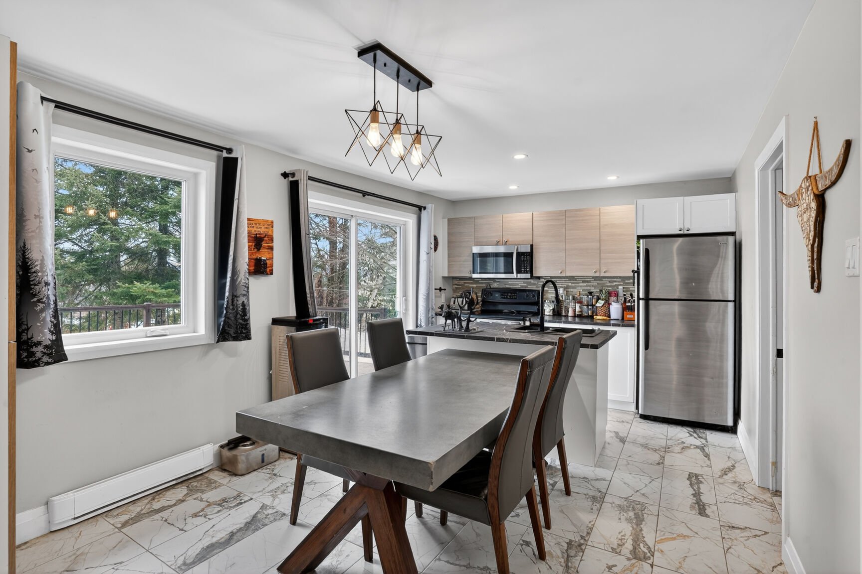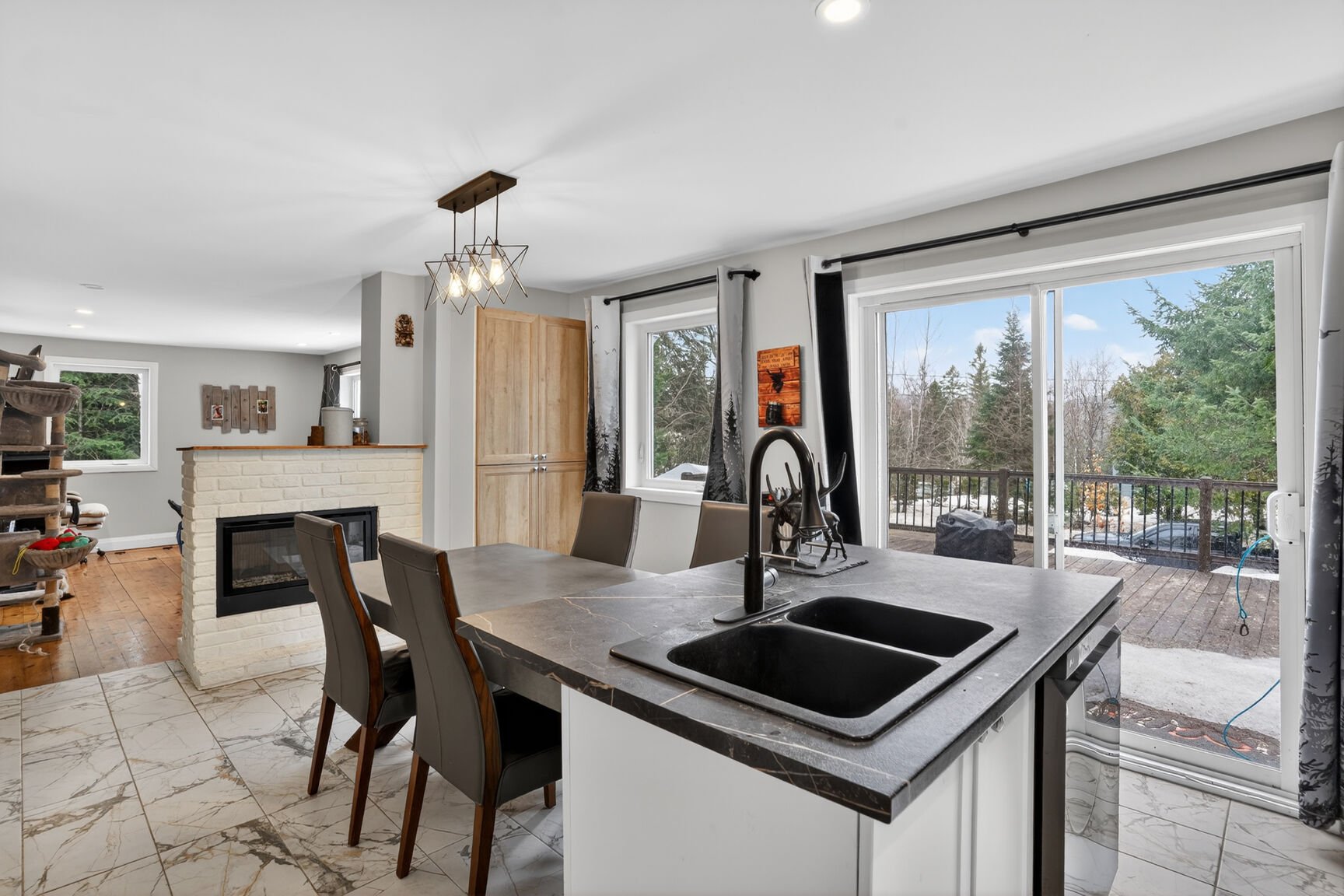 Dès l'entrée, vous serez accueilli par un salon spacieux agrémenté d'un foyer au propane, créant une ambiance chaleureuse et raffinée. La salle à manger lumineuse s'ouvre sur une cuisine au goût du jour au design soigné, mettant en valeur une superbe céramique effet marbré, un espace de travail optimisé et un rangement généreux. Une porte patio prolonge l'espace vers une vaste terrasse extérieure, idéale pour profiter des belles journées.