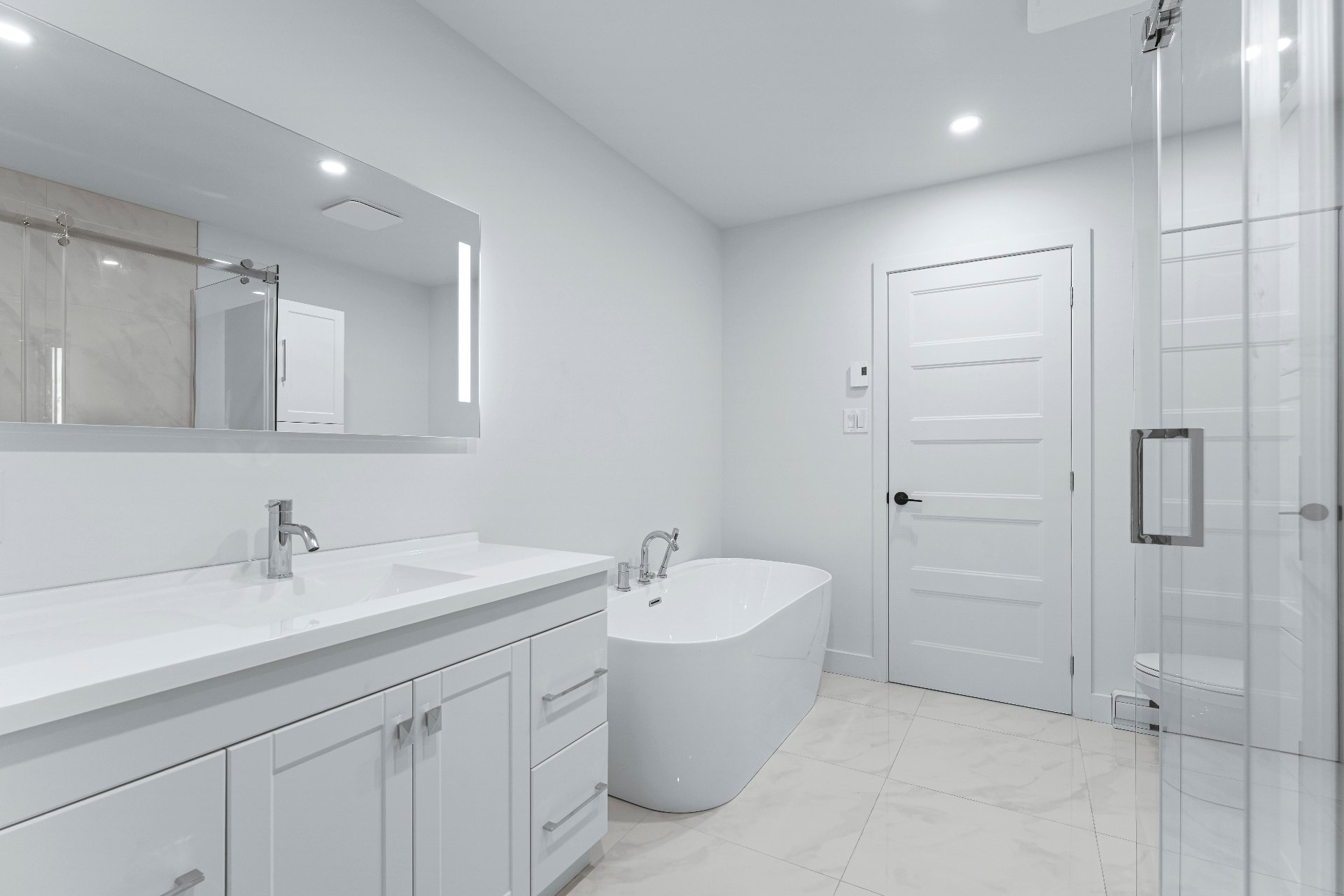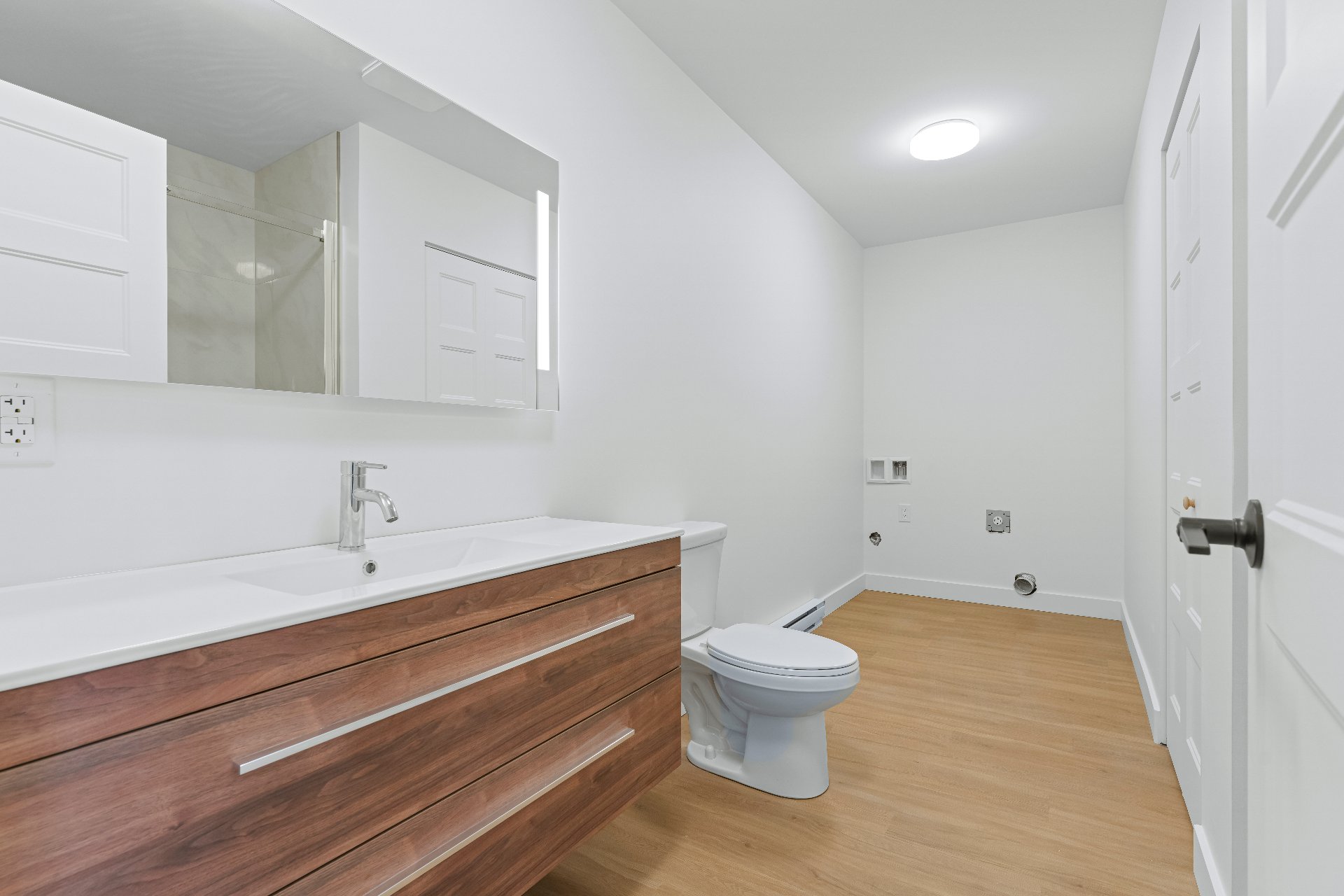 salle de bain complète avec espace laveuse-sécheuse, ainsi