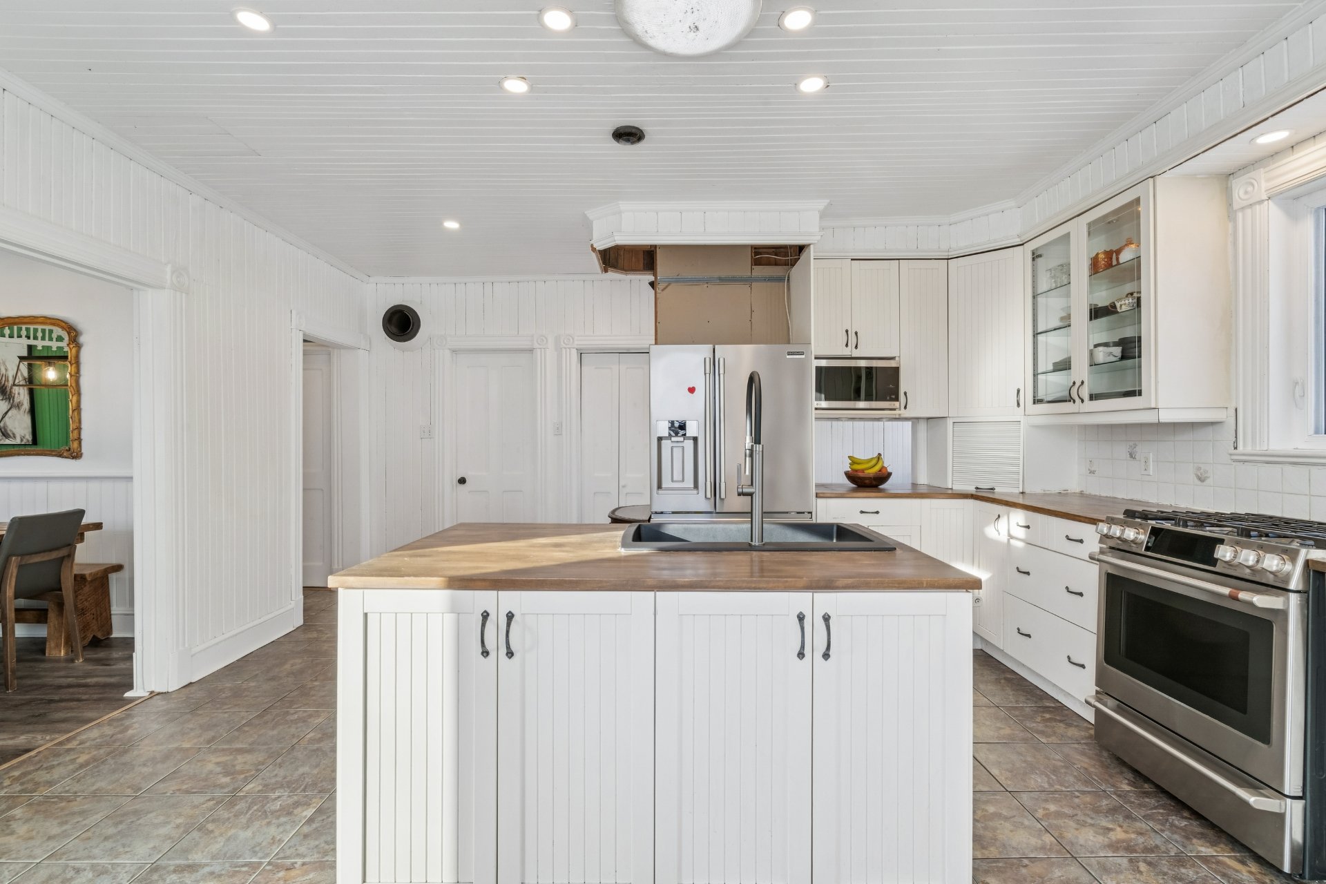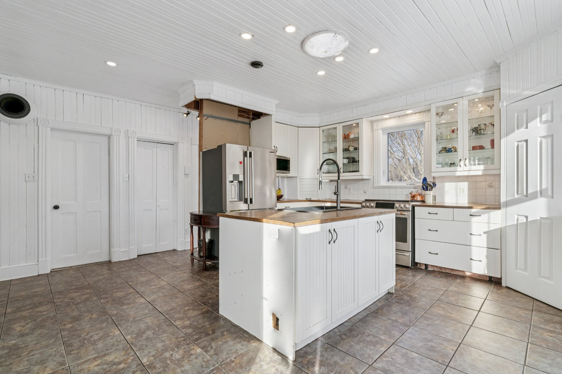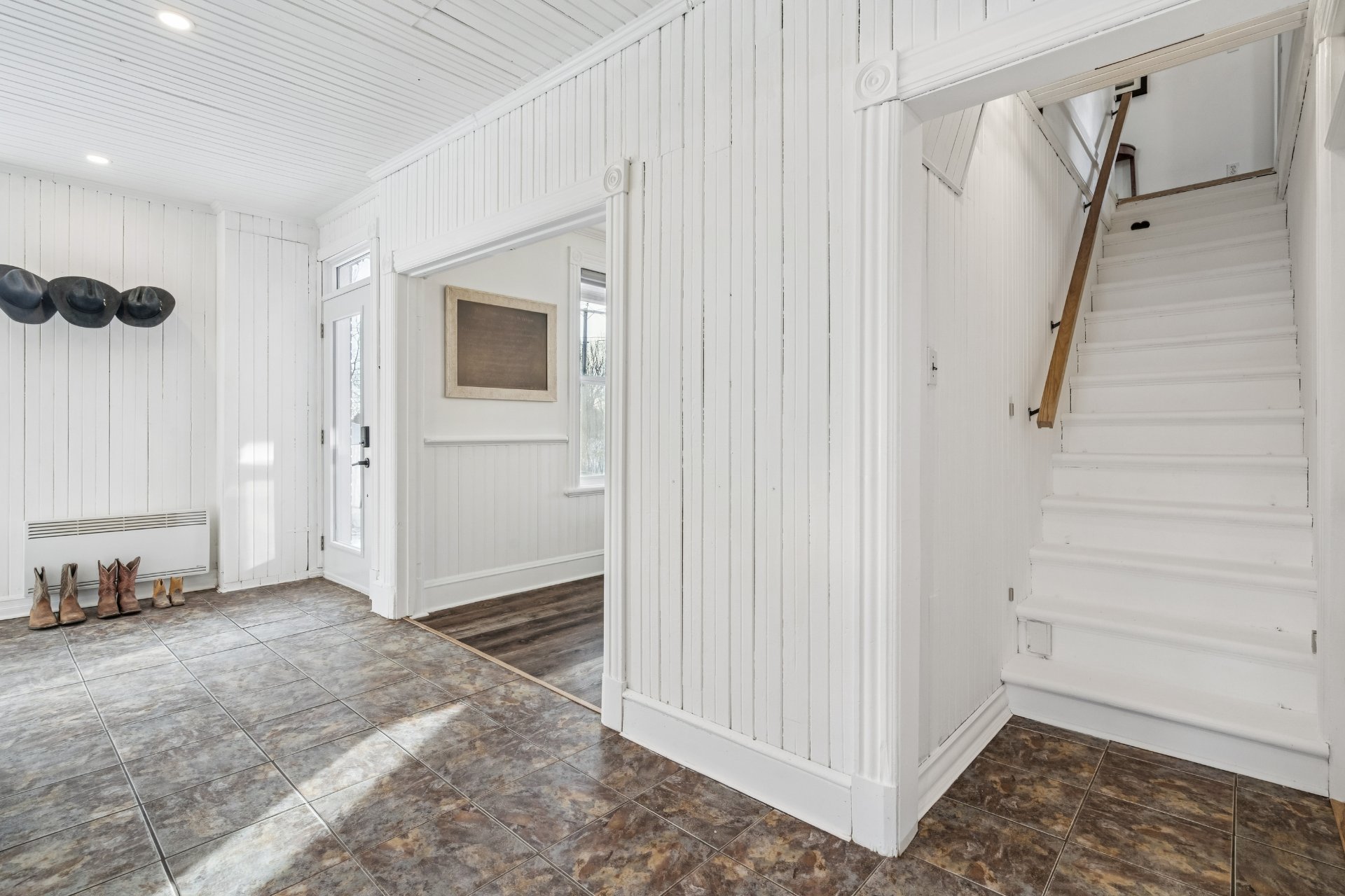 et crème, plafond en panneaux de bois blancs, deuxième