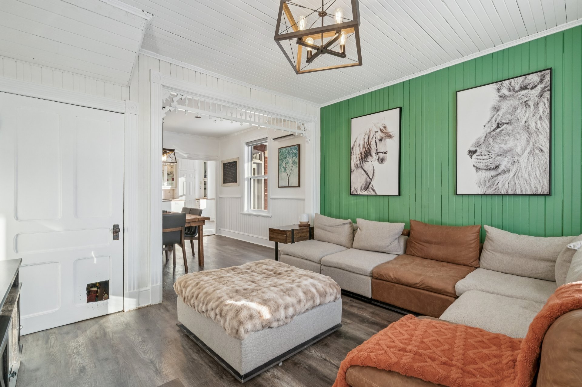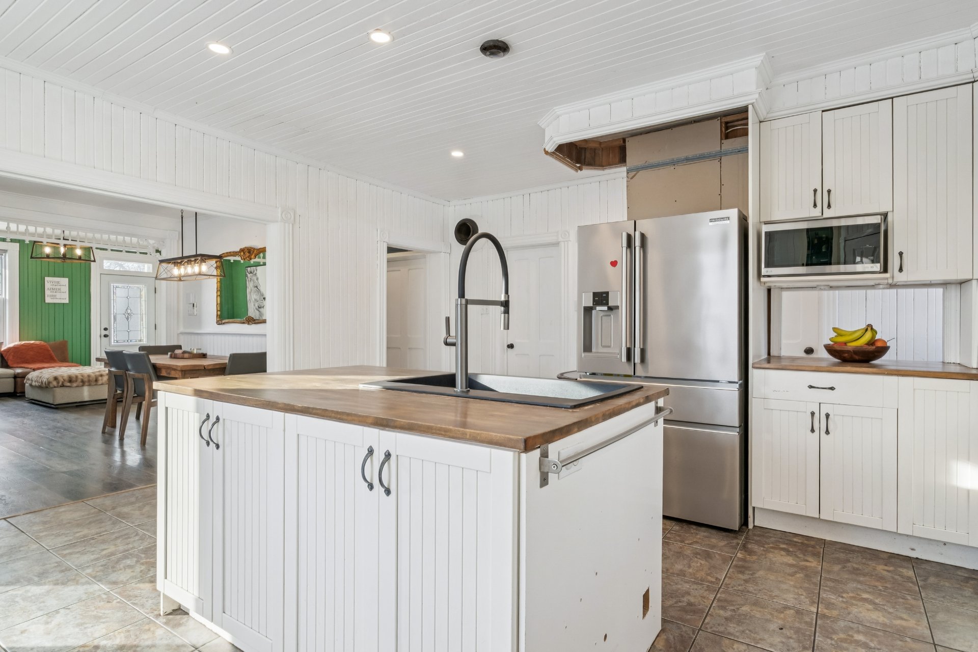cuisine et le salon, demi-mur avec panneaux de bois blancs,