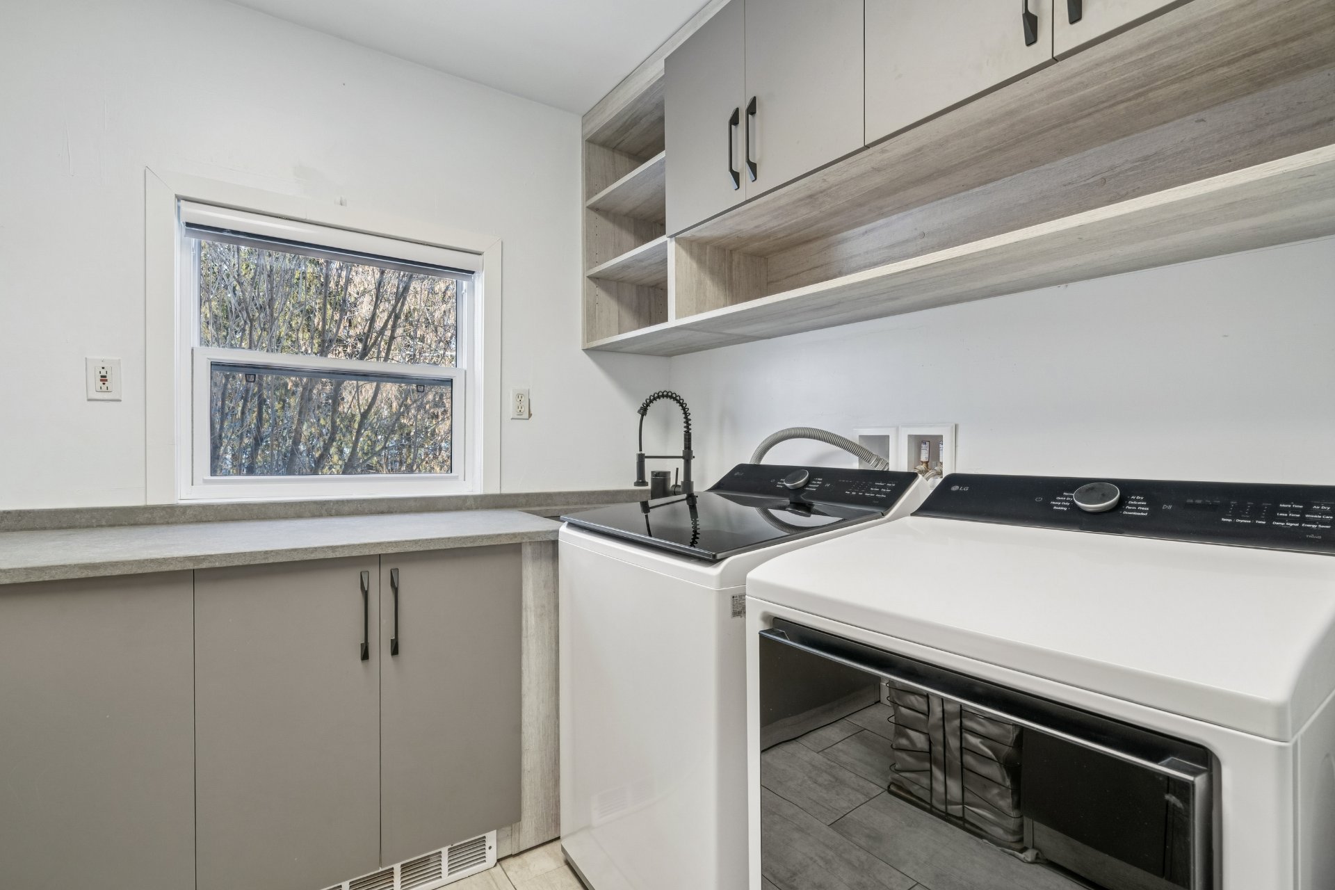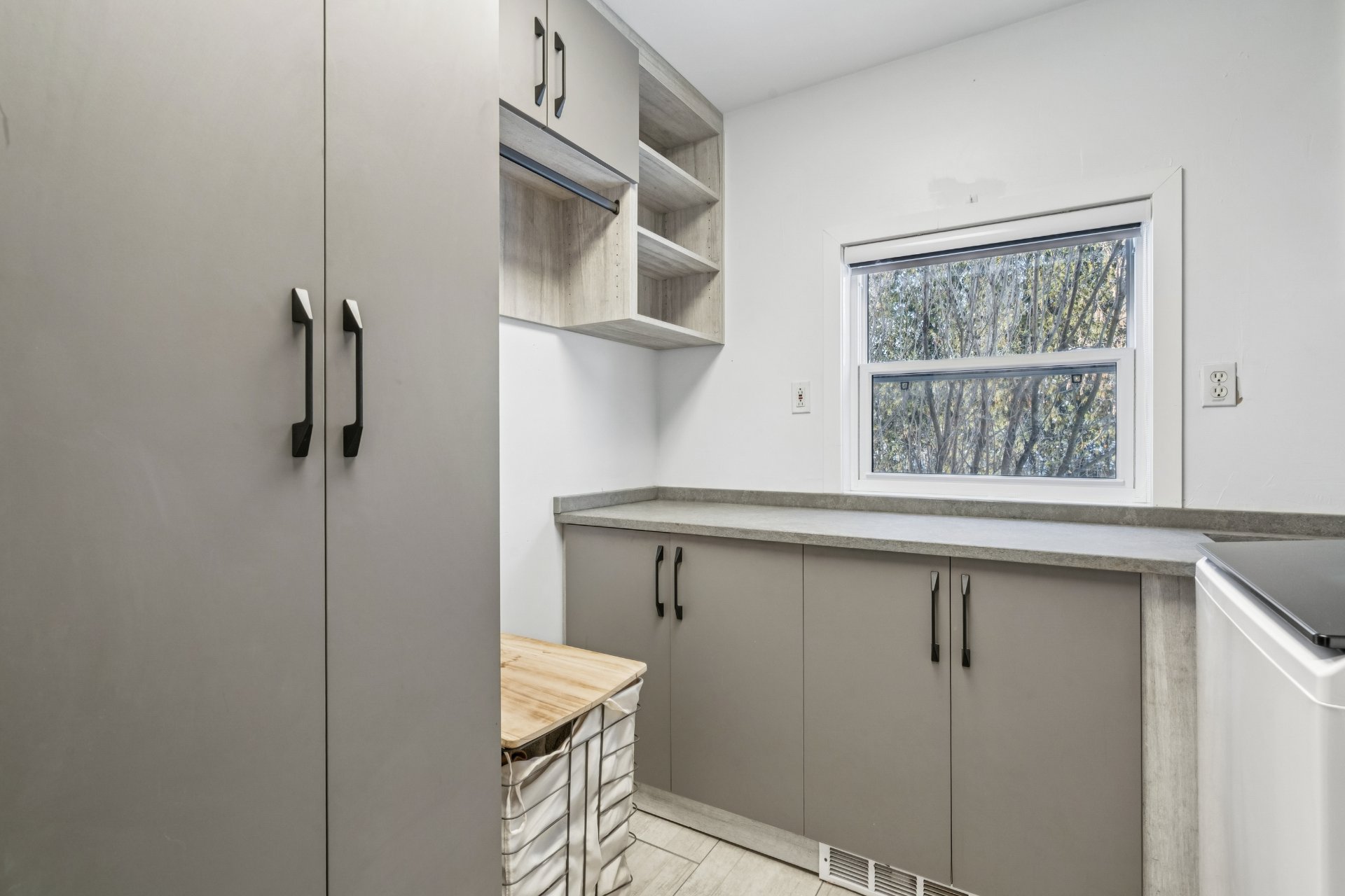Salle de lavage : Plancher en céramique, armoires de