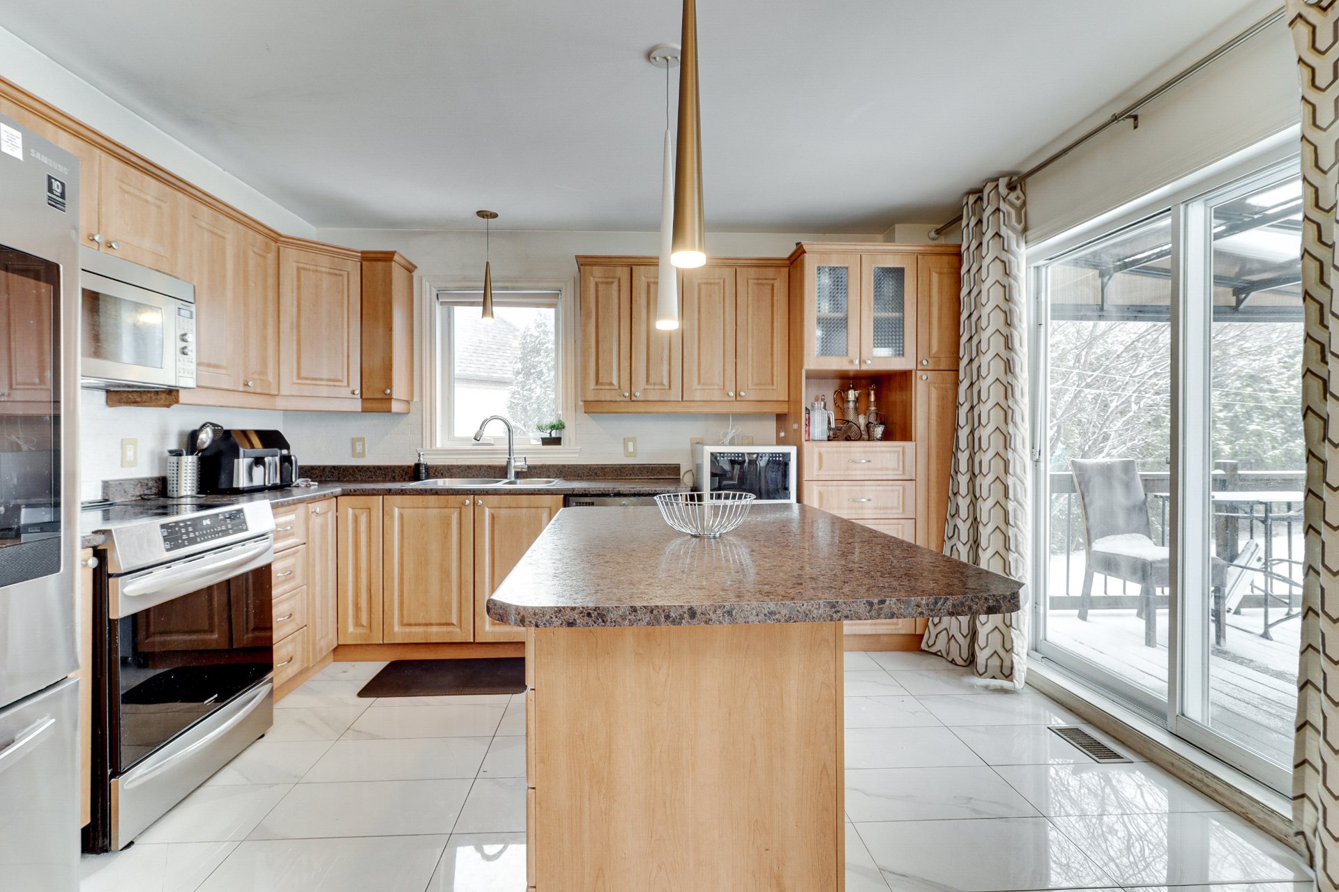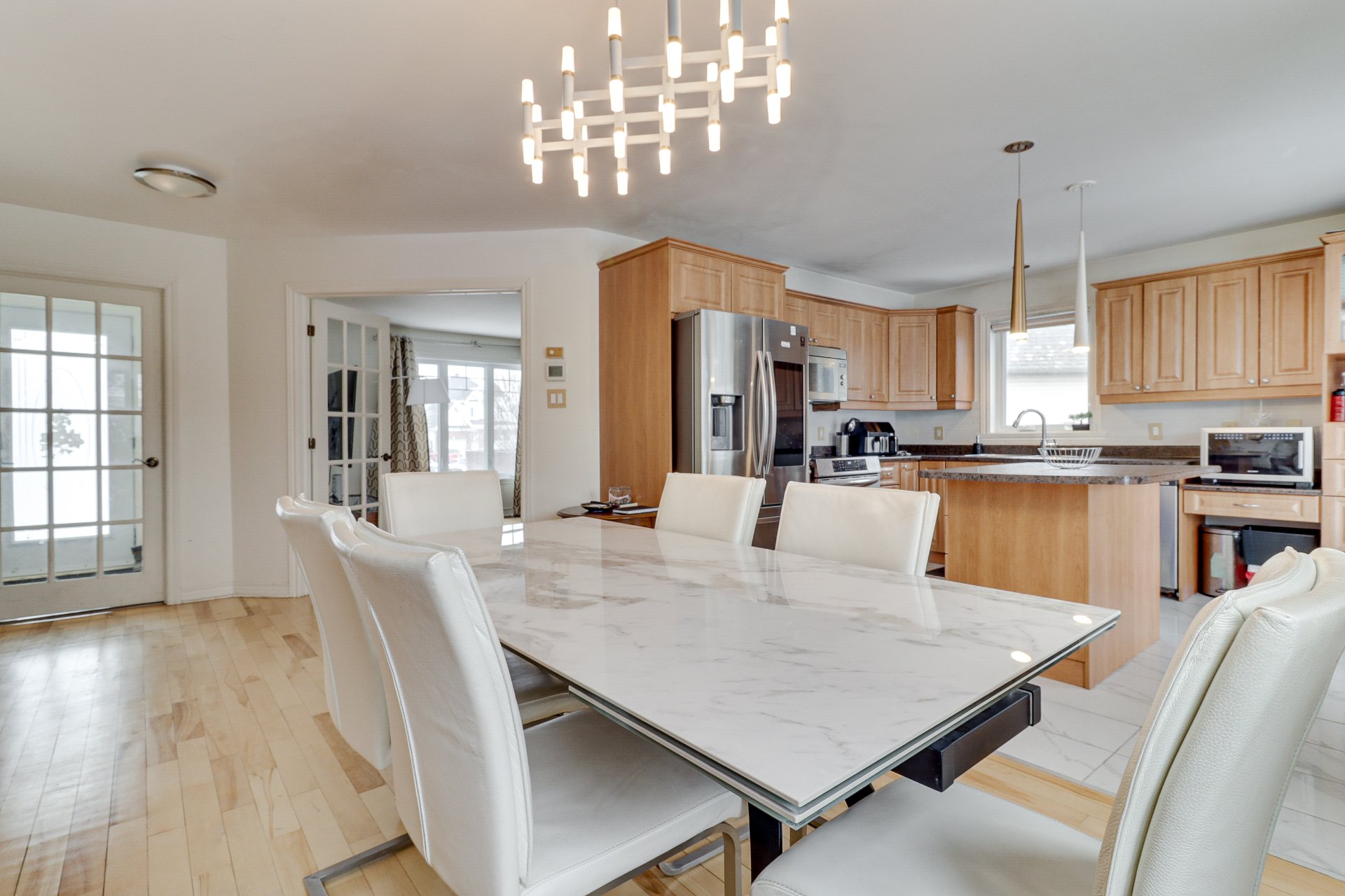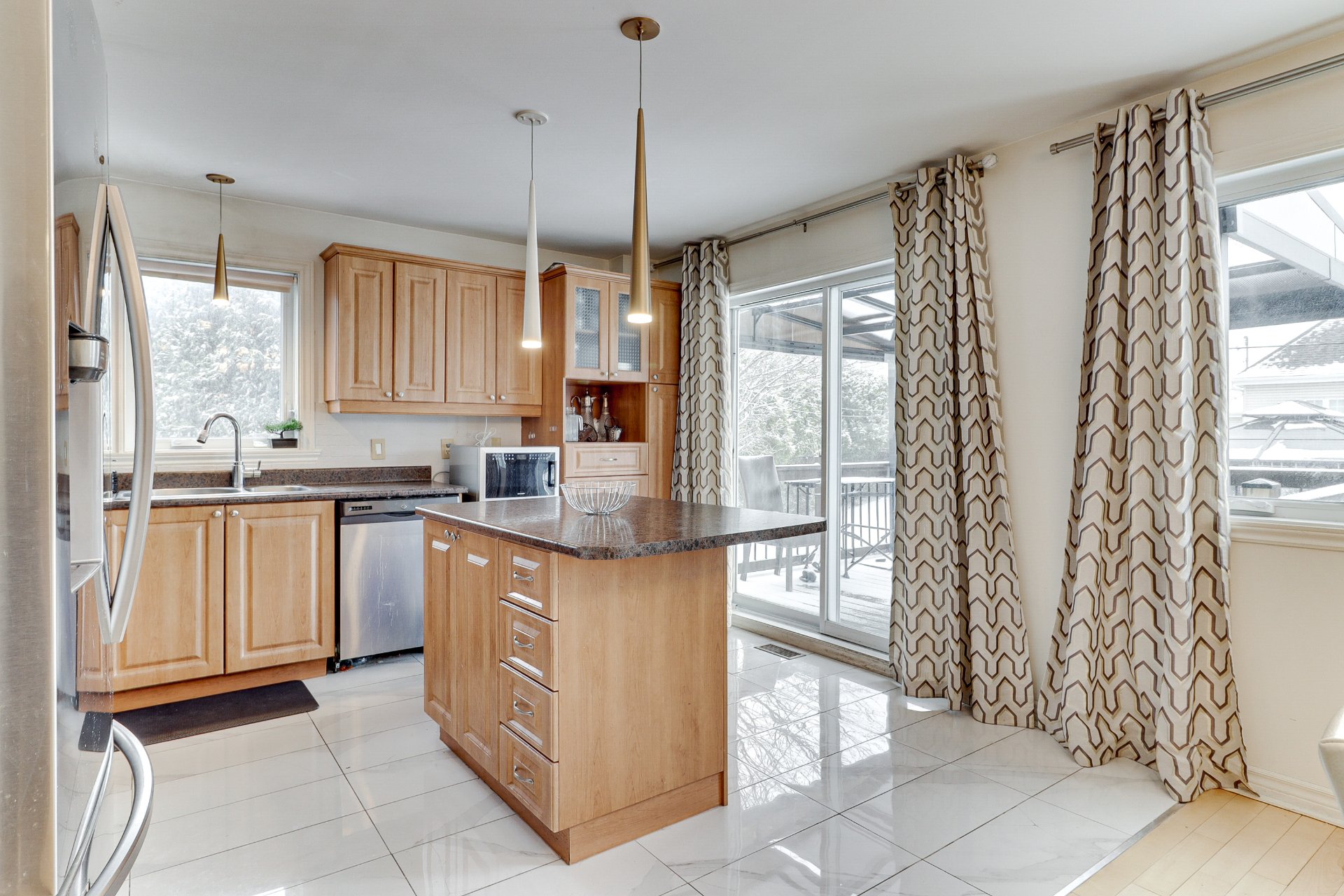 - Superbe cuisine avec îlot central, coin repas avec porte