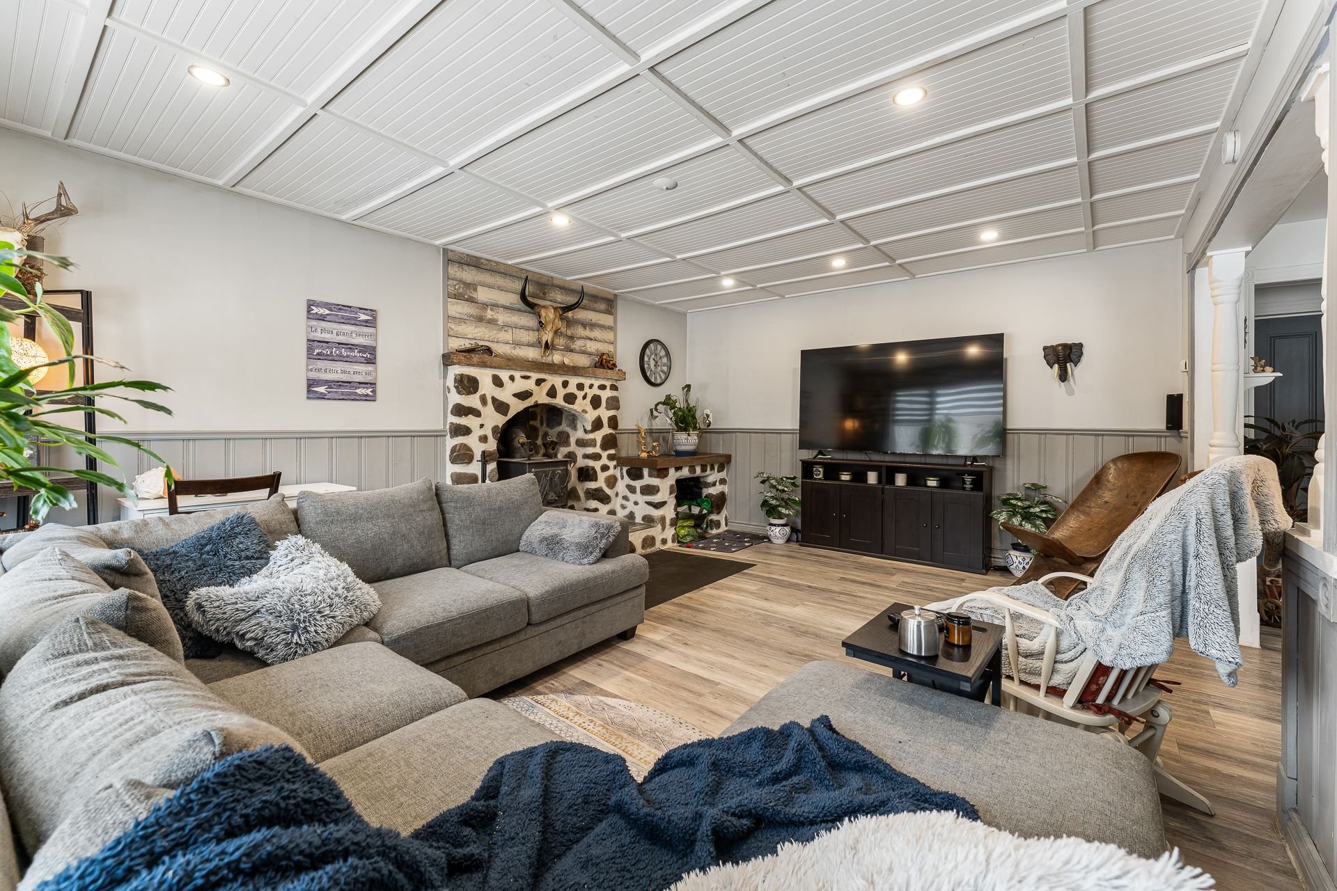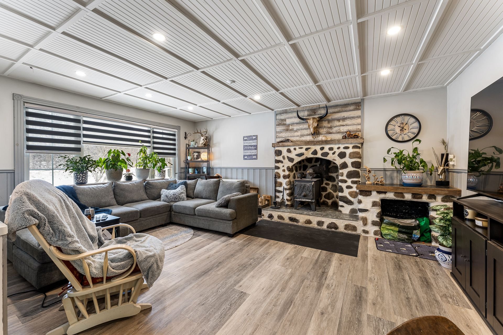 Le salon est agrémenté d'un poêle au bois, parfait pour