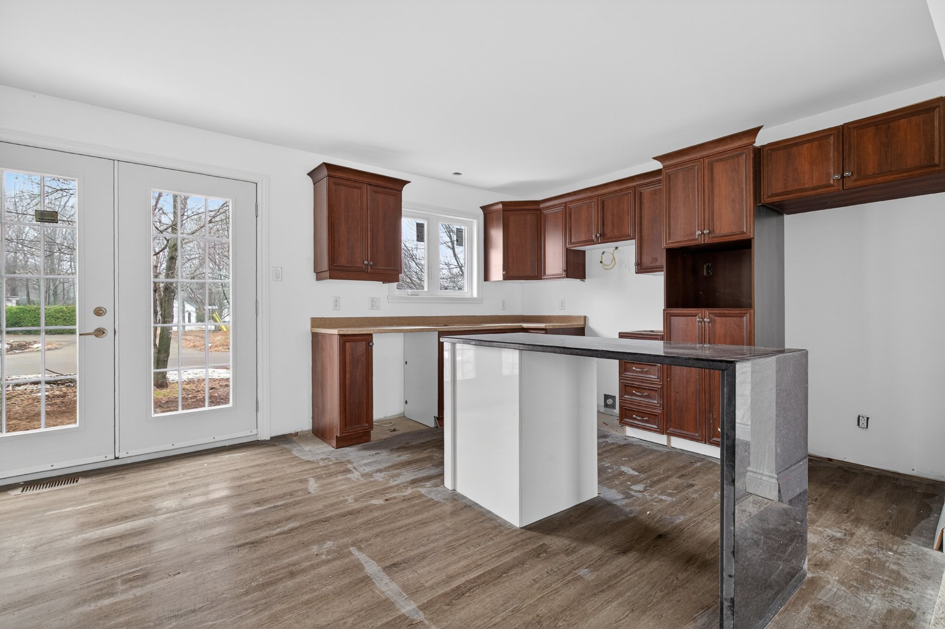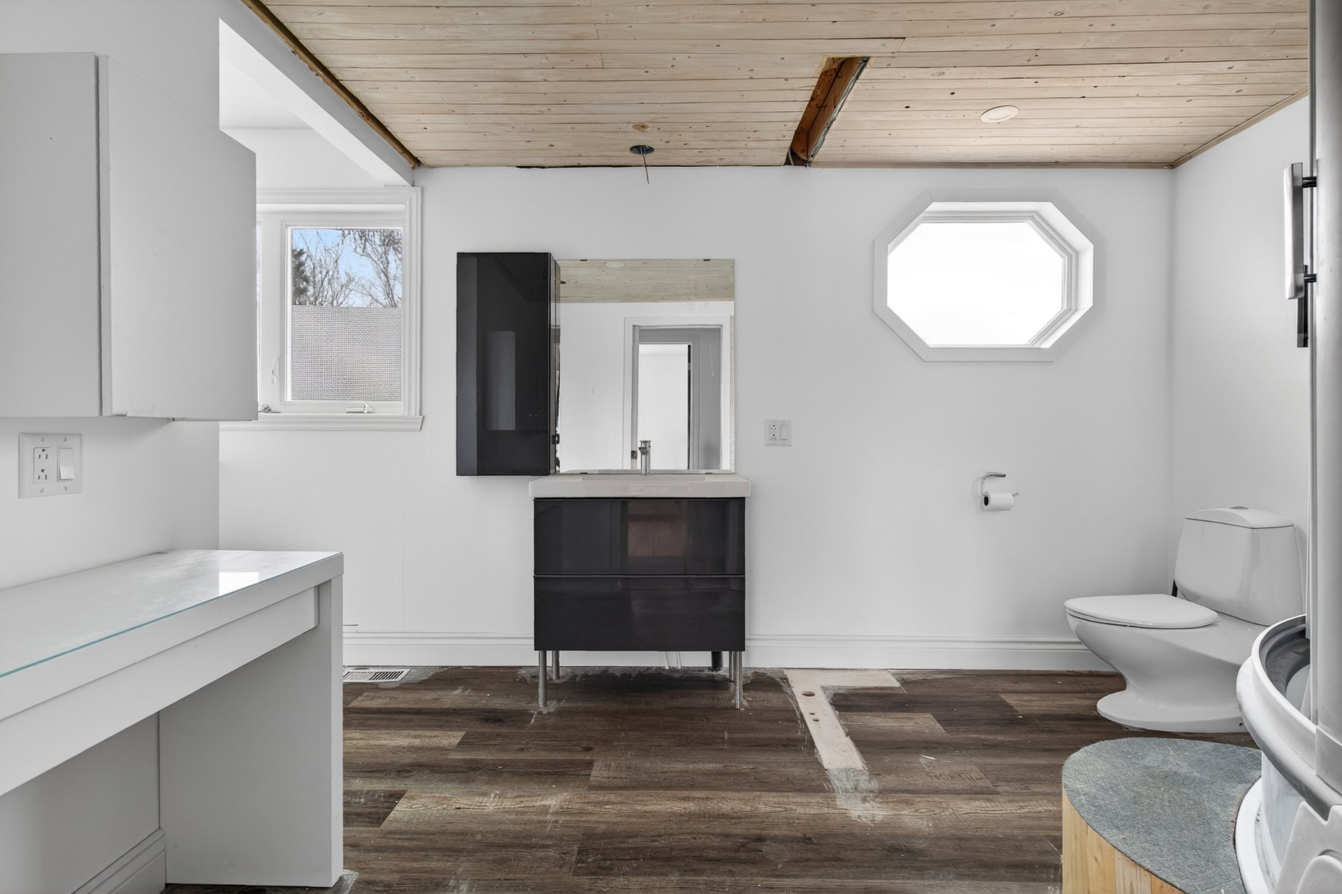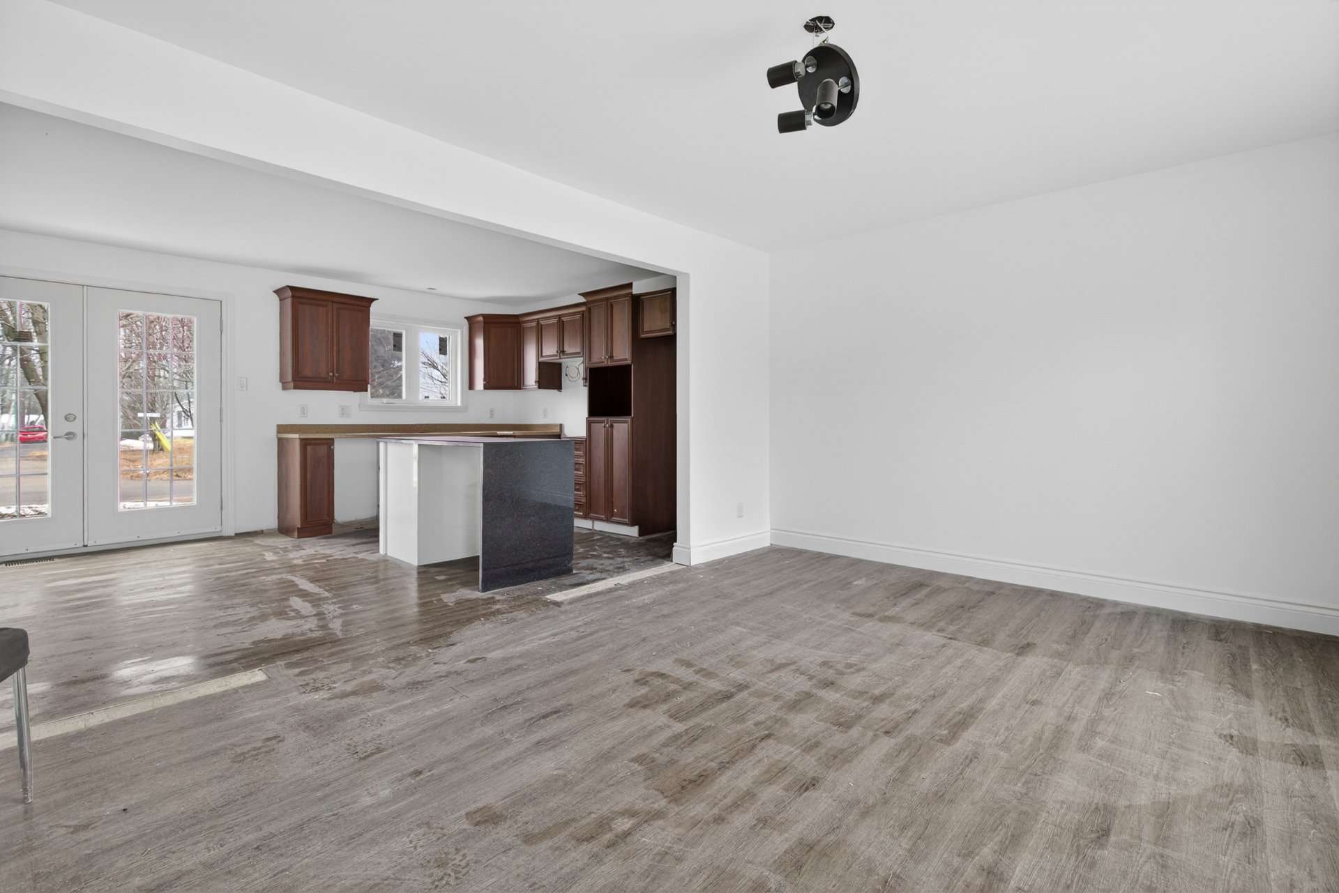 aspirateur centrale et tous ses accessoires, ilôt dans la cuisine, fixtures, luminaires, petit meuble dans la salle de bain